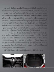 นอกจากนี้ ห้องโดยสารภายใน ได้ถูกออกแบบให้มีพื้นที่ใช้สอยอันกว้างขวาง ทั้งยังประกอบด้วยอุปกรณ์อ�านวยความสะดวกอันทันสมัย โดย The new CLA Shooting Brake มาพร้อมกับอุปกรณ์ติดตั้งมาตรฐานชุด EASY-PACK tailgate ระบบเปิด-ปิดบานประตูท้ายอัตโนมัติ ซึ่งท�างานในระบบกลไกกึ่งไฟฟ้า สามารถ เปิดได้จากปุ่มควบคุมเบาะนั่งผู้ขับขี่, บานประตูท้าย หรือจากกุญแจสตาร์ท เครื่องยนต์ และยังสามารถปิดลงอีกครั้งด้วยปุ่มควบคุมที่บานประตูท้าย พร้อมทั้ง การที่สามารถปรับที่นั่งผู้โดยสารด้านหลังออกเป็น 1/3 : 2/3 ตอน ท�าให้รถยนต์รุ่น นี้มีพื้นที่เก็บบรรทุกสัมภาระด้านหลังที่มีความจุถึง 495-1,354 ลิตร นับเป็นความ จุสูงสุดของรถยนต์หรูในเซ็กเมนต์นี้ ซึ่งพื้นที่นี้สามารถรองรับทุกอุปกรณ์กีฬาและ อุปกรณ์ท�างานคู่ใจ ซึ่งตอบโจทย์ทุกไลฟ์สไตล์ของผู้ขับได้เป็นอย่างดี The new CLA Shooting Brake ขับเคลื่อนด้วยเครื่องยนต์เบนซินแถวเรียง 4 สูบ เทอร์โบ พร้อมอินเตอร์คูลเลอร์ ความจุกระบอกสูบ 1,991 ซีซี ก�าลังแรงม้า สูงสุดที่ 211 แรงม้า ที่ 5,500 รอบ/นาที แรงบิด 350 นิวตันเมตร ที่ความเร็วรอบ 1,200-4,000 ต่อนาที อัตราเร่ง 0-100 กม./ชม. ที่ 6.9 วินาที ความเร็วสูงสุด 240 กม./ชม. และอัตราสิ้นเปลืองน�้ามันโดยเฉลี่ยอยู่ที่ 17.5-18.2 กม./ลิตร ขับเคลื่อน ด้วยระบบส่งก�าลังแบบเกียร์อัตโนมัติ 7G-DCT พร้อมระบบเปลี่ยนเกียร์ที่พวงมาลัย (Steering-wheel Gearshift Paddles) CLA 250 Shooting Brake AMG Sport ราคา 2,890,000 บาท