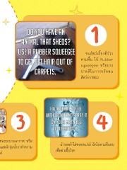 เคล็ดลับ 1 ขนสัตว์เลี้ยงที่ร่วง ตามพื้น ใช้ Rubber “ทำ�ความสะอาด” squeegee หรือยาง ปาดสีในการขจัดขน สัตว์จากพรม อุปกรณ์เครื่องใช้สุดเจ๋ง 3 4 ท�าความสะอาดช่องระบายอากาศ หรือ มู่ลี่ ด้วยมีดปาดเนยและผ้าจุ่มน�้ายาท�าความ น�าวอดก้าใส่ขวดสเปรย์ ฉีดไปตามที่นอน สะอาดอเนกประสงค์ เพื่อฆ่าเชื้อโรค