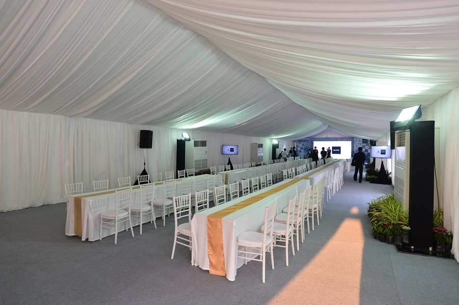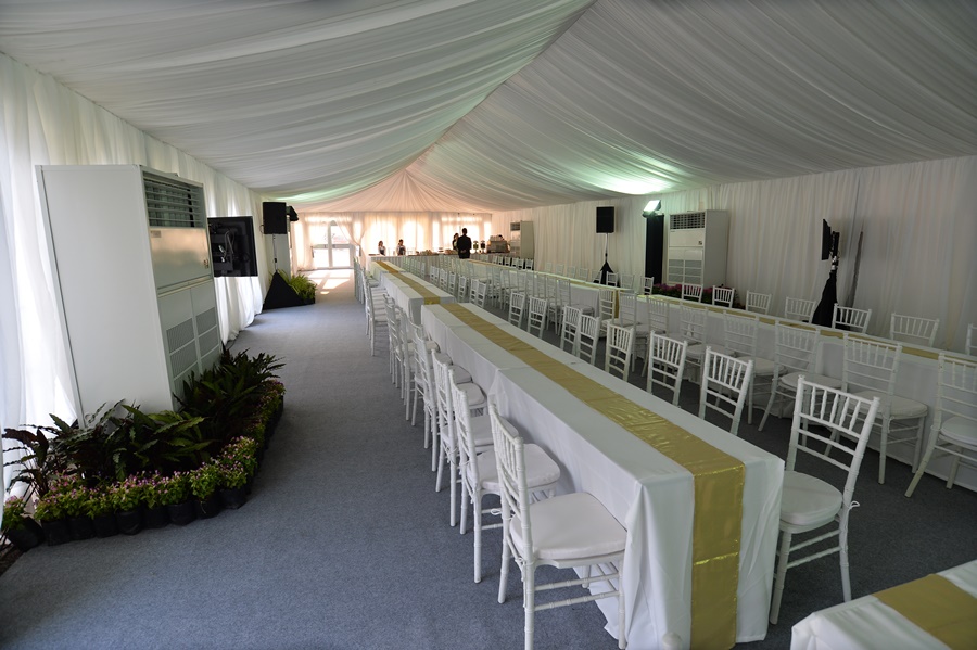 - จัดสร้างเต้นท์ต้อนรับ พร้อมติดแอร์และตกแต่งด้วยผ้า Eye liner ทั้งหลัง