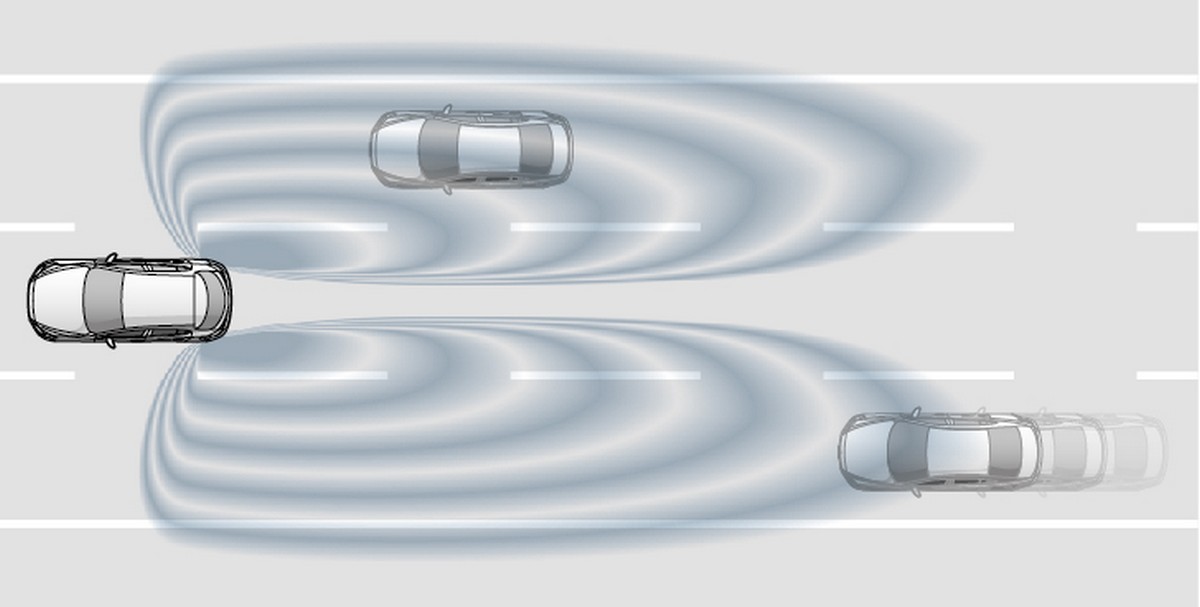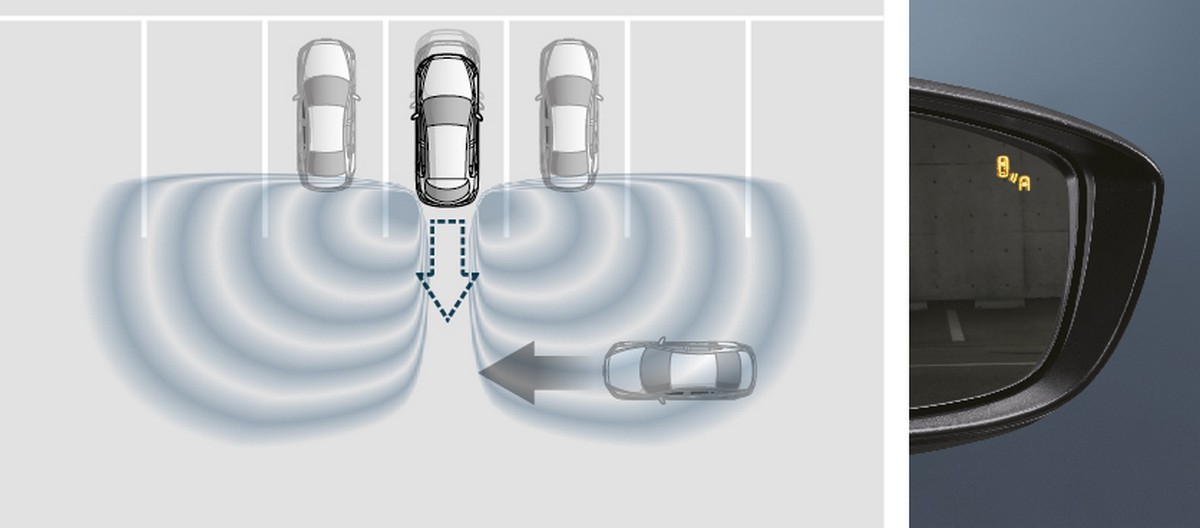 • ระบบเตือนเมื่อมีรถในจุดอับสายตาขณะถอยหลัง (Rear Cross Traffic Alert, RCTA)