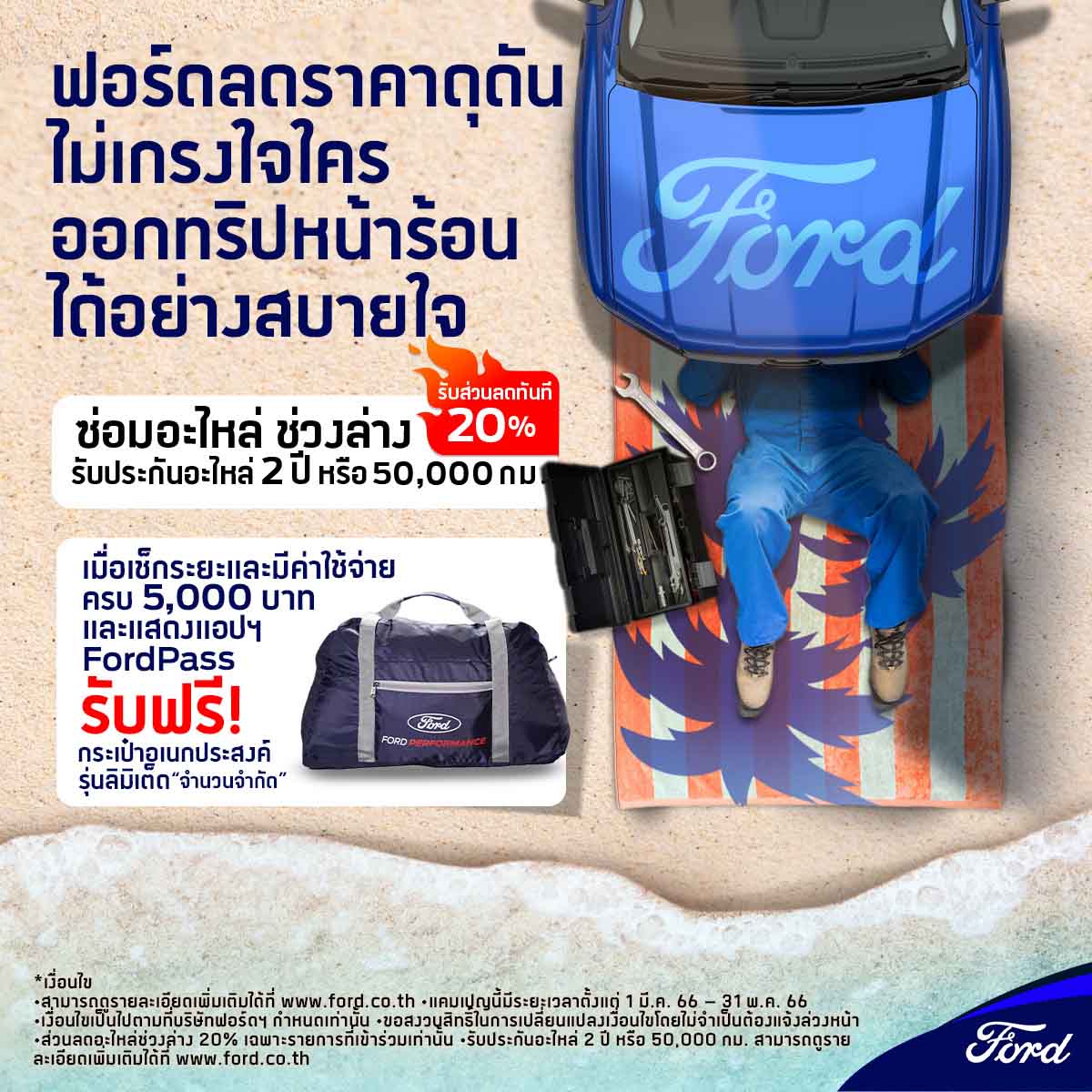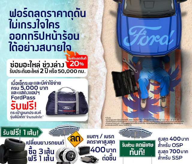 ฟอร์ด ประเทศไทย จัดแคมเปญ ‘ฟอร์ดลดดุดัน ไม่เกรงใจใคร’ ให้ลูกค้าออกทริปหน้าร้อนได้อย่างสบายใจด้วยข้อเสนอสุดพิเศษด้านบริการ อาทิ ส่วนลดพิเศษชุดน้ำมันเครื่องสุดคุ้ม (Oil Save Pack) สูงสุด 400 บาท หรือส่วนลดโปรแกรมบำรุงรักษาตามระยะ (SSP) สูงสุด 700 บาท เมื่อแสดงเอกสารจากโปรแกรมประเมินค่าใช้จ่ายในการเข้ารับบริการ (Service Price Calculator) ส่วนลดค่าอะไหล่ช่วงล่าง 20% ซื้อยางรถยนต์ 3 เส้น แถมฟรี 1 เส้น และส่วนลดเมื่อเปลี่ยนผ้าเบรกหรือแบตเตอรี่ บริการตรวจเช็คสภาพรถทั่วไปฟรี 30 รายการ เพียงนำรถเข้ารับบริการที่ศูนย์บริการฟอร์ดทั่วประเทศตั้งแต่วันที่ 1 มีนาคม – 30 มิถุนายน 2566