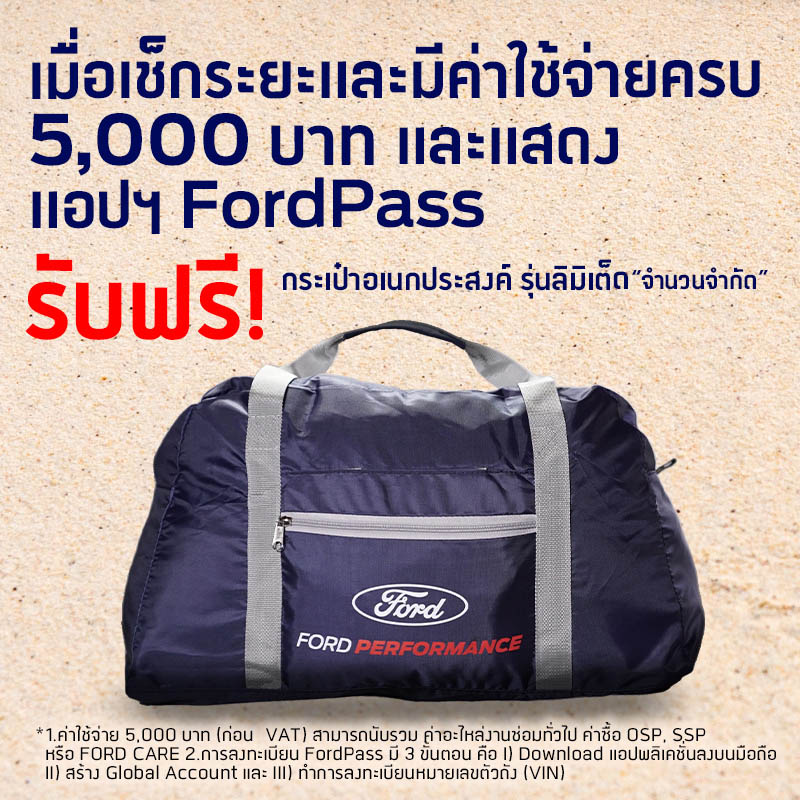 นอกจากนี้ เมื่อลูกค้ามีค่าใช้จ่ายเช็กระยะมากกว่า 5,000 บาทไม่รวม VAT ขึ้นไป และ มีการแสดงแอปพลิเคชัน FordPass ที่มีการลงทะเบียนเสร็จทั้ง 3 ขั้นตอน คือ 1. ดาวน์โหลดแอปพลิเคชันลงบนมือถือ 2. สร้างบัญชีผู้ใช้งาน 3. ลงทะเบียนหมายเลขตัวถังรถ พร้อมทําการจองเช็กระยะครั้งถัดไป ลูกค้าจะได้รับกระเป๋าเอนกประสงค์รุ่นลิมิเต็ด ฟรีทันที สินค้ามีจำนวนจำกัด