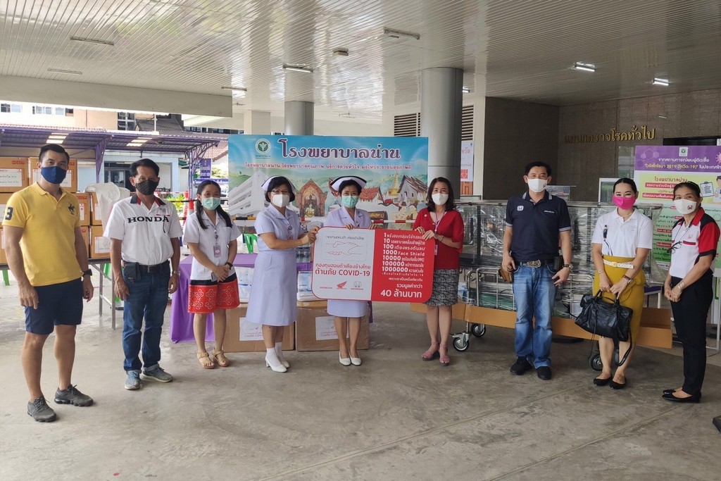 ตัวแทนผู้จำหน่ายรถยนต์ฮอนด้า บริษัท น่านฮอนด้าคาร์ส์ จำกัด พร้อมด้วยตัวแทนผู้จำหน่ายรถจักรยานยนต์ฮอนด้า หจก.เที่ยงธรรมมอเตอร์ หจก.จงเกษมมอเตอร์น่าน และ หจก.คูกวงหลี ส่งมอบเตียงผู้เคลื่อนย้ายผู้ป่วยแบบแรงดันลบและอุปกรณ์การแพทย์ ให้แก่ โรงพยาบาลน่าน จังหวัดน่าน