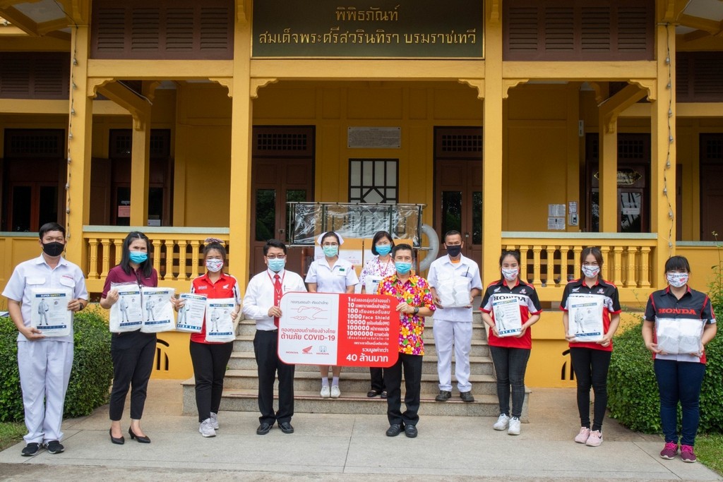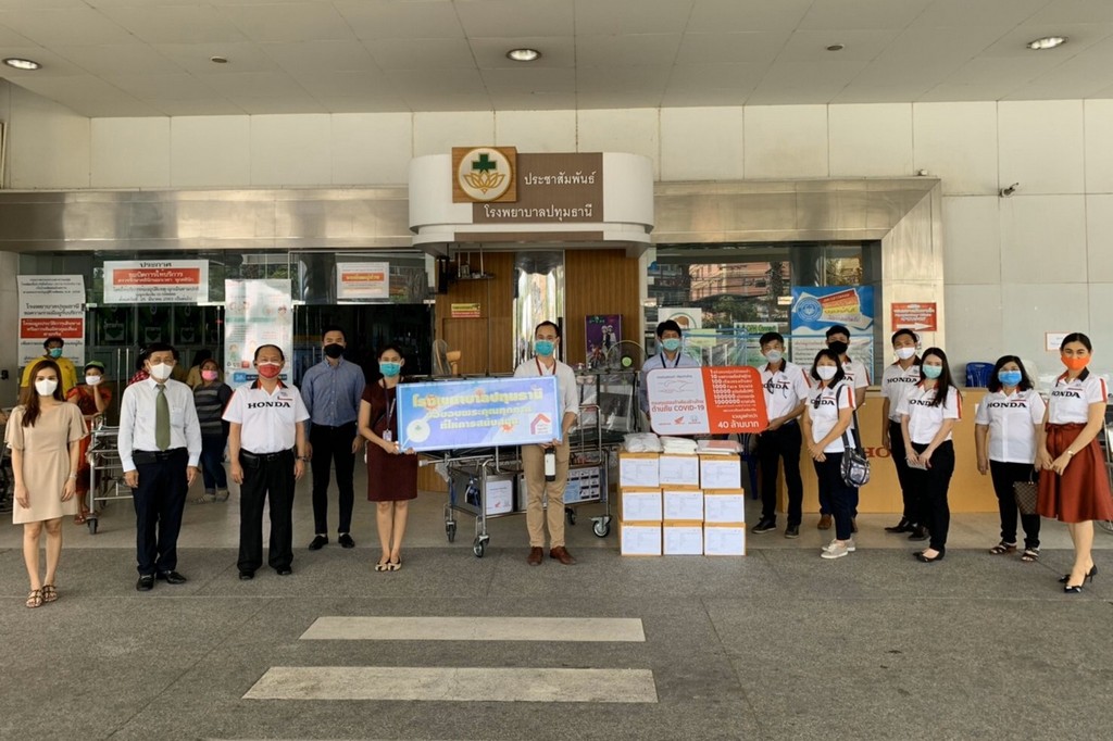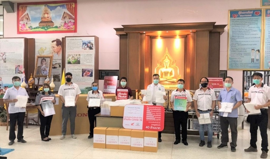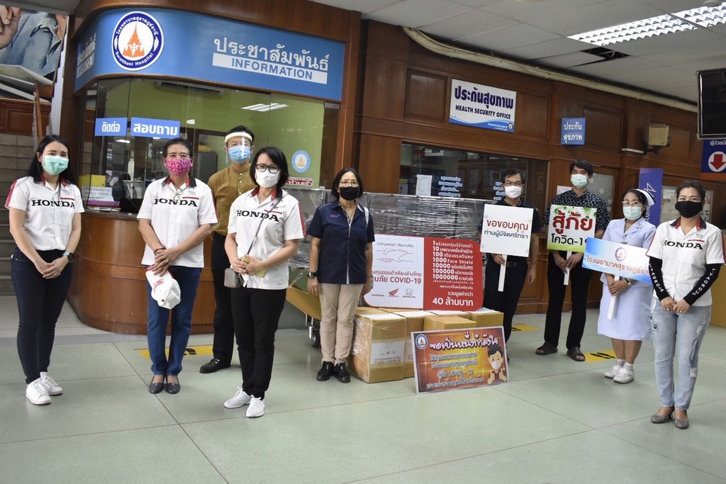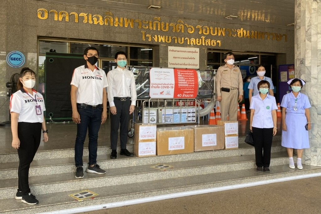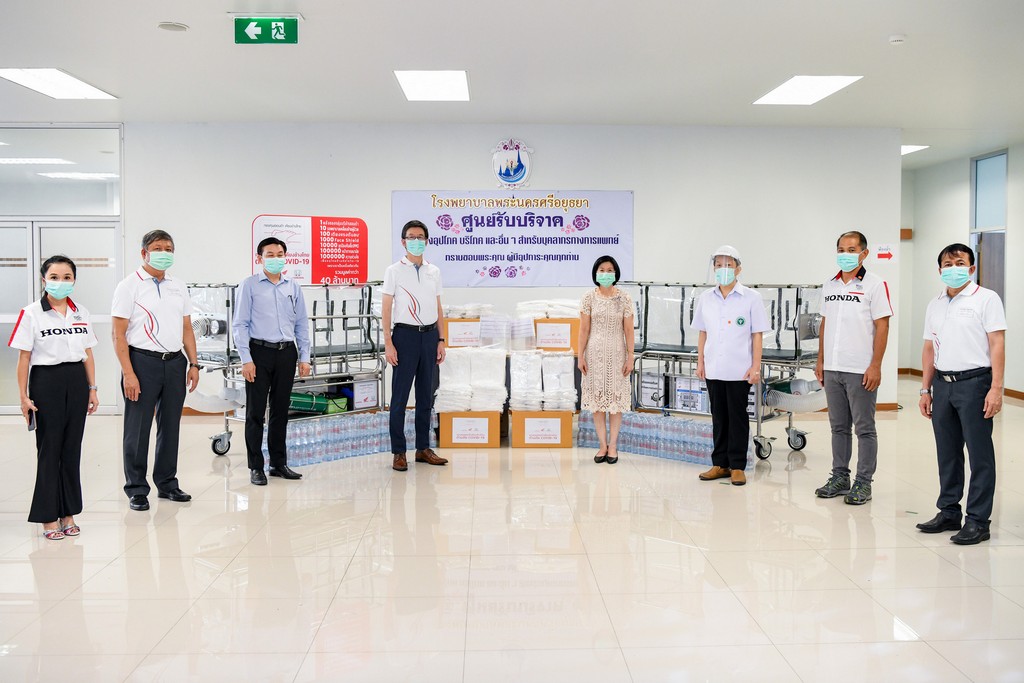 มร.ทาเคชิ คัมเบะ (ที่สี่จากซ้าย) ผู้ช่วยประธานกรรมการบริหาร บริษัท ฮอนด้า ออโตโมบิล (ประเทศไทย) จำกัด พร้อมด้วย ผู้แทนคณะกรรมการมูลนิธิฮอนด้าประเทศไทย และตัวแทนจากบริษัทฯ พร้อมด้วยตัวแทนผู้จำหน่ายรถยนต์และรถจักรยานยนต์ฮอนด้าจังหวัดพระนครศรีอยุธยา ได้แก่ บริษัท จ.เจริญชัย ฮอนด้าคาร์ส์ จำกัด และบริษัท เสนามอเตอร์ไซด์ จำกัด ร่วมส่งมอบเตียงเคลื่อนย้ายผู้ป่วยแบบแรงดันลบจำนวน 1 เตียง ชุดป้องกันเชื้อ PPE 100 ชุด หน้ากาก Face Shield 10 ชิ้น และหน้ากากอนามัยแบบผ้า 1,000 ชิ้น ให้แก่โรงพยาบาลพระนครศรีอยุธยา โดยมีนางสาวนุชนาถ ประทีปธีรานันต์ (ที่สี่จากขวา) รองผู้ว่าราชการจังหวัดพระนครศรีอยุธยา และ นพ.ธีระชัย คงเอี่ยมตระกูล (ที่สามจากขวา) ผู้อำนวยการโรงพยาบาลฯ รับมอบ