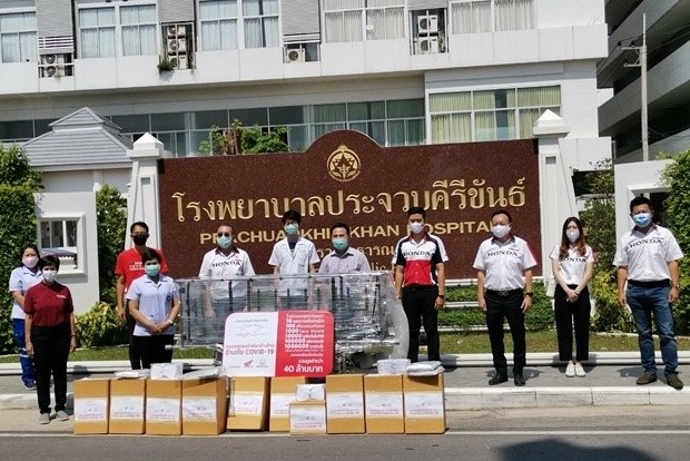 ผู้แทนคณะกรรมการมูลนิธิฮอนด้าประเทศไทย และตัวแทนของบริษัท ฮอนด้า ออโตโมบิล (ประเทศไทย) จำกัด พร้อมด้วยตัวแทนผู้จำหน่ายรถจักรยานยนต์ฮอนด้าจังหวัดพระนครศรีอยุธยาจาก บริษัท ป.เปามอเตอร์เซอร์วิส จำกัด ร่วมส่งมอบเตียงเคลื่อนย้ายผู้ป่วยแบบแรงดันลบจำนวน 1 เตียง ชุดป้องกันเชื้อ PPE 100 ชุด หน้ากาก Face Shield 10 ชิ้น และหน้ากากอนามัยแบบผ้า 1,000 ชิ้น ให้แก่โรงพยาบาลวังน้อย จังหวัดพระนครศรีอยุธยา โดยมี นพ.สุนทร โรจนสุริยาวงศ์ (ที่สองจากขวา) ผู้อำนวยการโรงพยาบาลฯ รับมอบ
