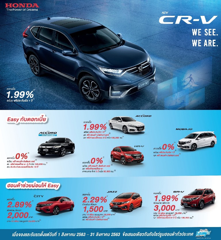 โดยรถยนต์ฮอนด้าแต่ละรุ่นมาพร้อมข้อเสนอพิเศษเพื่อให้ลูกค้าเป็นเจ้าของได้ง่ายขึ้น อาทิ ดอกเบี้ยพิเศษเริ่มต้น 0% หรือ ข้อเสนอ “Double Smile” ดาวน์เริ่มต้น 0 บาท หรือ ฮอนด้าช่วยผ่อน และข้อเสนออื่นๆ อีกมากมาย สำหรับลูกค้าที่จองรถยนต์ฮอนด้าภายในงานฯ ระหว่างวันที่ 21 – 30 สิงหาคม 2563 และมอบข้อเสนอเดียวกันเพื่ออำนวยความสะดวกแก่ลูกค้าที่จองและรับรถที่โชว์รูมฮอนด้าทั่วประเทศ ตั้งแต่ วันที่ 1 – 31 สิงหาคม 2563