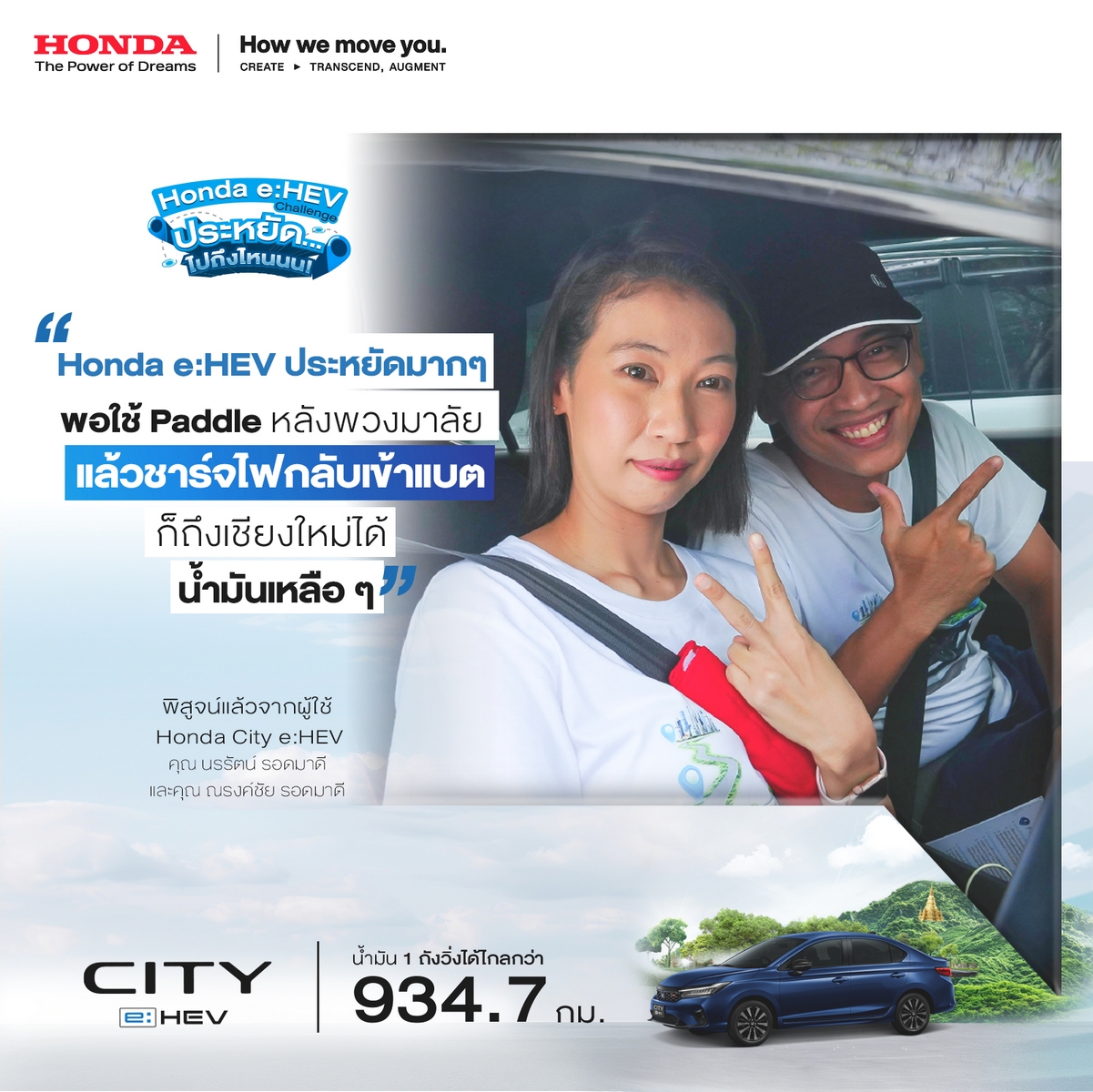 - ลูกค้าผู้ชนะ รุ่น ฮอนด้า ซิตี้ อี:เอชอีวี น้ำมัน 1 ถัง ขับได้ระยะทางรวมกว่า 934.7 กิโลเมตร