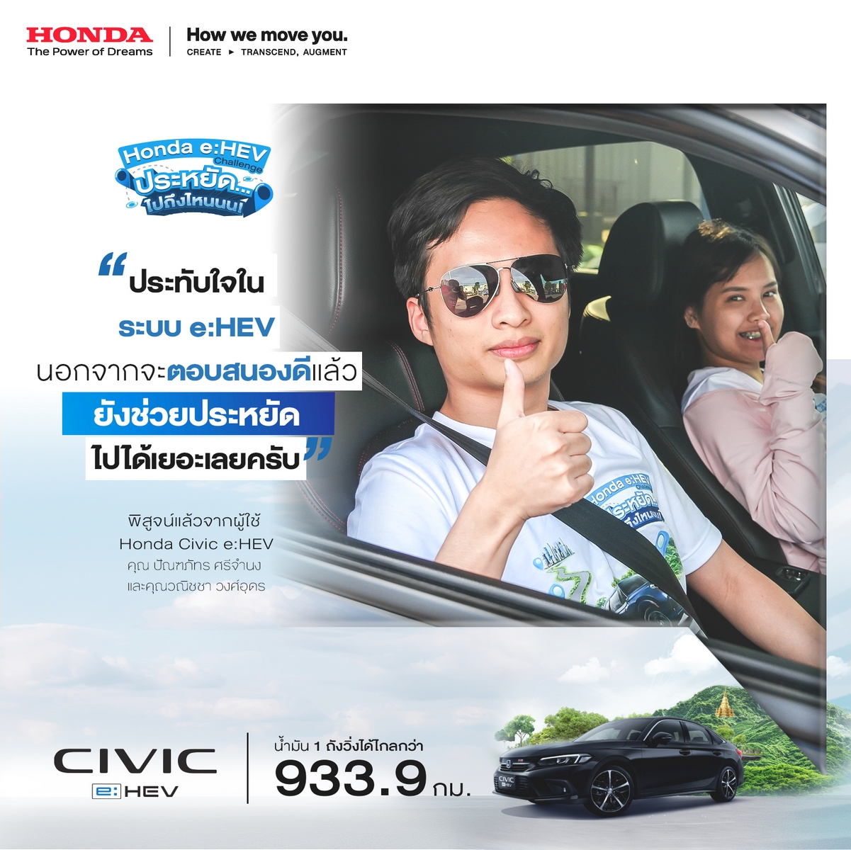 - ลูกค้าผู้ชนะ รุ่น ฮอนด้า ซีวิค อี:เอชอีวี น้ำมัน 1 ถัง ขับได้ระยะทางรวมกว่า 933.9 กิโลเมตร