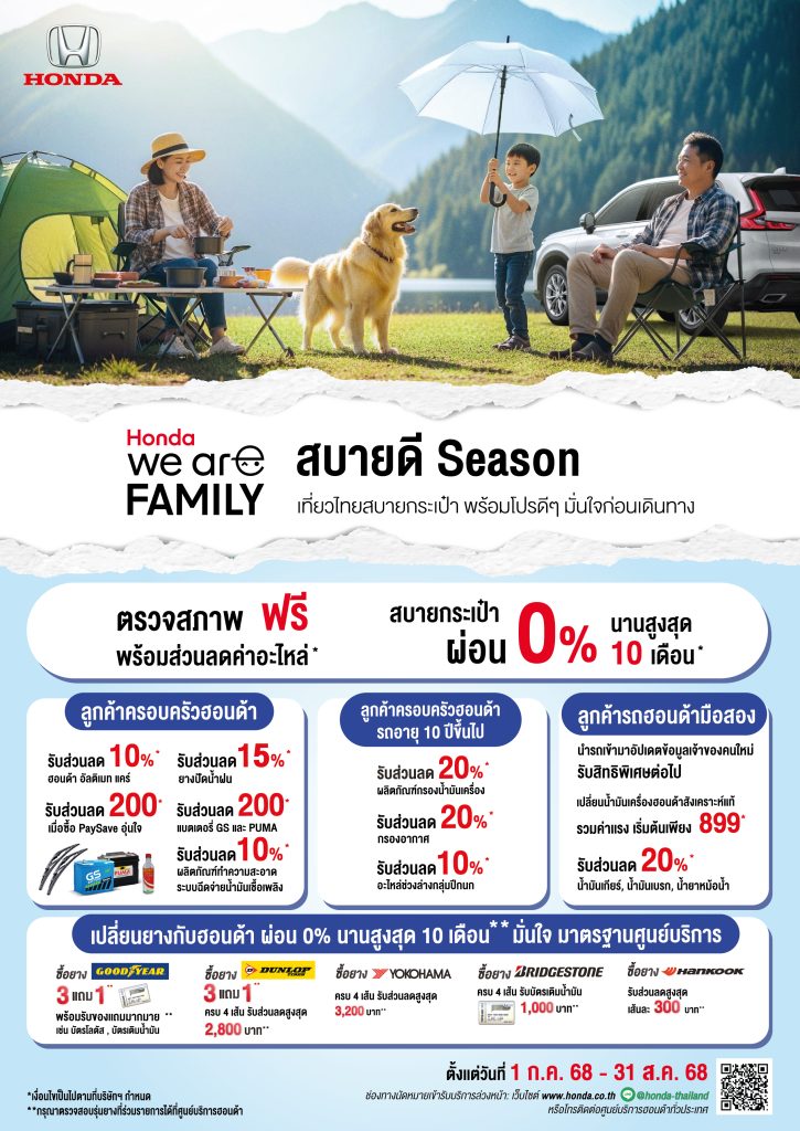 ***ระยะเวลาแคมเปญ ‘สบายดี Season บริการหลังการขาย ผ่อนสบาย 0%’ ตั้งแต่วันที่ 1 กรกฎาคม 2568 – 31 สิงหาคม 2568 เงื่อนไขเป็นไปตามที่บริษัท ฮอนด้า ออโตโมบิล (ประเทศไทย) จำกัด กำหนด