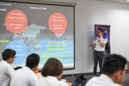 ในช่วงเช้า คณะสื่อมวลชนพบกัน ณ ศูนย์ฝึกอบรม บริษัท ฮอนด้า ออโตโมบิล (ประเทศไทย) จำกัด (นิคมอุตสาหกรรมบางชัน) เพื่อรับฟังข้อมูลผลิตภัณฑ์ และสัมผัสกับ ฮอนด้า ซีวิค ใหม่ มาพร้อมดีไซน์สปอร์ตพรีเมียมที่ท้าทายทุกสายตา ด้วยเส้นสายโฉบเฉี่ยวรอบคัน สะท้อนเอกลักษณ์แห่งความสง่างามที่ลงตัวในทุกการขับขี่ ดีไซน์ดุดันยิ่งขึ้นด้วยกันชนหน้าและกระจังหน้าในสไตล์สปอร์ตใหม่แบบ RS เชื่อมต่อกับไฟหน้าดีไซน์สปอร์ตพร้อมไฟส่องสว่างสำหรับการขับขี่ในเวลากลางวันแบบ LED Daytime Running Light (DRL) ทั้งยังโดดเด่นด้วยไฟท้าย LED รูปทรงตัว C (C-Identity) เอกลักษณ์แบบซีวิค ไฟตัดหมอกแบบ LED ตกแต่งด้วยคิ้วโครเมียม กันชนหลังตกแต่งด้วยโครเมียมใหม่ และเสาอากาศแบบครีบฉลาม (Shark Fin) เพิ่มความโฉบเฉี่ยวและให้ความรู้สึกหรูหรา พร้อมล้ออัลลอย 17 นิ้ว ดีไซน์สปอร์ตใหม่ ดึงดูดทุกสายตา และสีใหม่ สีน้ำเงินบริลเลียนท์ สปอร์ตตี้ (Brilliant Sporty Blue)