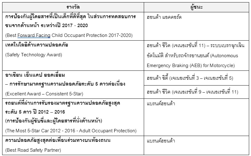 บริษัท ฮอนด้า ออโตโมบิล (ประเทศไทย) จำกัด ประกาศความสำเร็จจากการคว้า 6 รางวัลด้านความปลอดภัย ในงานฉลองครบรอบ 10 ปี ASEAN NCAP (New Car Assessment Program for Southeast Asian) โดยเป็นแบรนด์ผู้ผลิตรถยนต์ที่ได้รับรางวัลมากที่สุดภายในงาน สะท้อนถึงความมุ่งมั่นในการสร้างสรรค์และนำเสนอยนตรกรรมคุณภาพที่มาพร้อมเทคโนโลยีความปลอดภัยสูงสุดในหลากหลายเซกเมนต์ ตอกย้ำเจตนารมณ์ในการสร้างสังคมปลอดอุบัติเหตุอย่างยั่งยืน ที่พร้อมมอบความมั่นใจและความสุขสำหรับผู้ใช้รถใช้ถนนทุกคนในทุกเส้นทาง