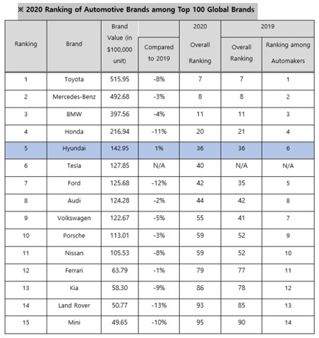 บริษัท ฮุนได มอเตอร์ จำกัด ประสบความสำเร็จในการเพิ่มมูลค่าของแบรนด์ในระดับโลก และในระหว่างแบรนด์ผู้ผลิตรถยนต์ จากผลของแบรนด์ที่ยอดเยี่ยมที่สุดในโลกปี 2563 ของบริษัท Interbrand โดยผลสำรวจแสดงให้เห็นว่ามูลค่าแบรนด์ฮุนไดเพิ่มขึ้น 1 เปอร์เซ็นต์ เมื่อเทียบกับปีที่ผ่านมามีมูลค่า 14.3 พันล้านเหรียญสหรัฐ จัดอยู่ในอันดับที่ 5 ของแบรนด์รถยนต์และอันดับที่ 36 ของโลก แม้ว่าสถานการณ์การตลาดที่หดตัวจากการแพร่ระบาดของโรคโควิด 19