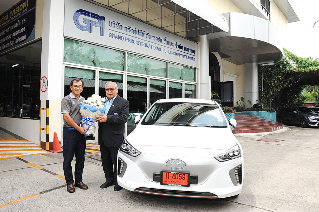 มร.โตชิฮิเดะ อาโนะ ประธานบริษัท ฮุนได มอเตอร์ (ไทยแลนด์) จำกัด ส่งมอบรถยนต์พลังงานไฟฟ้า ฮุนไดไออนิคคันแรกให้แก่ ดร.ปราจิน เอี่ยมลำเนา ประธานบริษัท กรังด์ปรีซ์ อินเตอร์เนชั่นแนล จำกัด (มหาชน) ซึ่งเป็นลูกค้าวีไอพีที่ให้เกียรติเลือกใช้รถยนต์ฮุนได และมอบความไว้วางใจในแบรนด์มาโดยตลอด