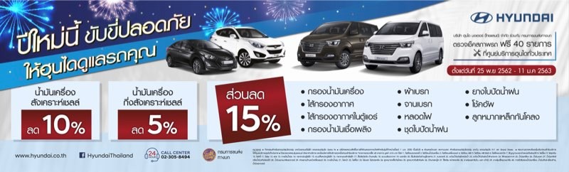 พิเศษในช่วงเทศกาลท่องเที่ยว ฮุนได เชิญชวนลูกค้าเตรียมรถให้พร้อมเพื่อการขับขี่ที่ปลอดภัย โดยลูกค้าสามารถนำรถยนต์ฮุนไดทุกรุ่นเข้ารับบริการตรวจเช็คสภาพรถยนต์ฟรี 40 รายการที่ศูนย์บริการรถยนต์ฮุนไดทั่วประเทศ พร้อมรับส่วนลดพิเศษ 15% สำหรับค่าอะไหล่ อาทิ ผ้าเบรก กรองน้ำมันเครื่อง ไส้กรองอากาศ เป็นต้น ส่วนลด 10% สำหรับน้ำมันเครื่องสังเคราะห์เชลส์ และส่วนลด 5% สำหรับน้ำมันเครื่องกึ่งสังเคราะห์เชลส์ ลูกค้าสามารถรับสิทธิพิเศษนี้ได้ตั้งแต่วันนี้ ถึงวันที่ 11 มกราคม 2563 สอบถามข้อมูลและรายละเอียดเพิ่มเติมที่ ฮุนไดคอลเซ็นเตอร์ 02-305 8494 หรือ www.hyundai.co.th