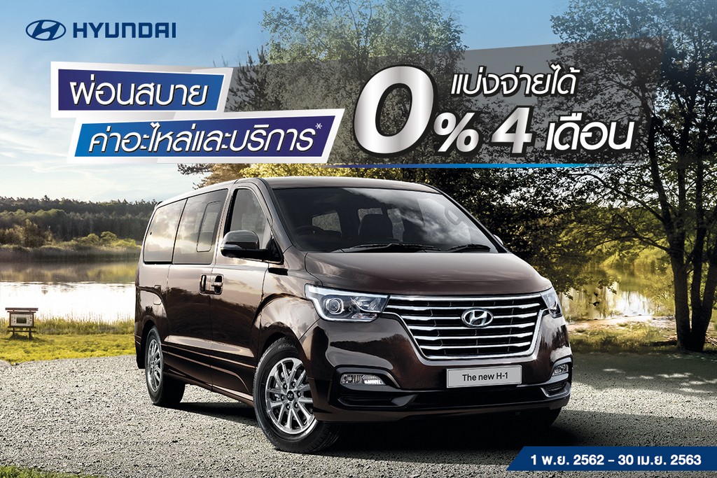 บริษัท ฮุนได มอเตอร์ (ไทยแลนด์) จำกัด มอบแคมเปญ “ผ่อนสบาย 0% สำหรับค่าอะไหล่และบริการ” ช่วยแบ่งเบาภาระค่าใช้จ่ายให้กับลูกค้าในการนำรถยนต์เข้ารับบริการ ณ ศูนย์บริการฮุนไดที่ร่วมรายการ โดยลูกค้าสามารถใช้สิทธิ์ผ่อนชำระค่าใช้จ่ายดอกเบี้ย 0% นานสูงสุด 4 เดือน สำหรับค่าอะไหล่และค่าบริการที่มีจำนวนยอดค่าใช้จ่ายขั้นต่ำ 8,000 บาทต่อ 1 ใบเสร็จ โดยเลือกผ่อนชำระค่าใช้จ่ายผ่านบัตรเครดิตของธนาคารที่ร่วมรายการได้แก่ ธนาคารกรุงศรีอยุธยา ธนาคารกสิกรไทย และธนาคารกรุงเทพ ลูกค้าสามารถรับสิทธิประโยชน์นี้ได้ตั้งแต่วันที่ 1 พฤศจิกายน 2562 จนถึงวันที่ 30 เมษายน 2563