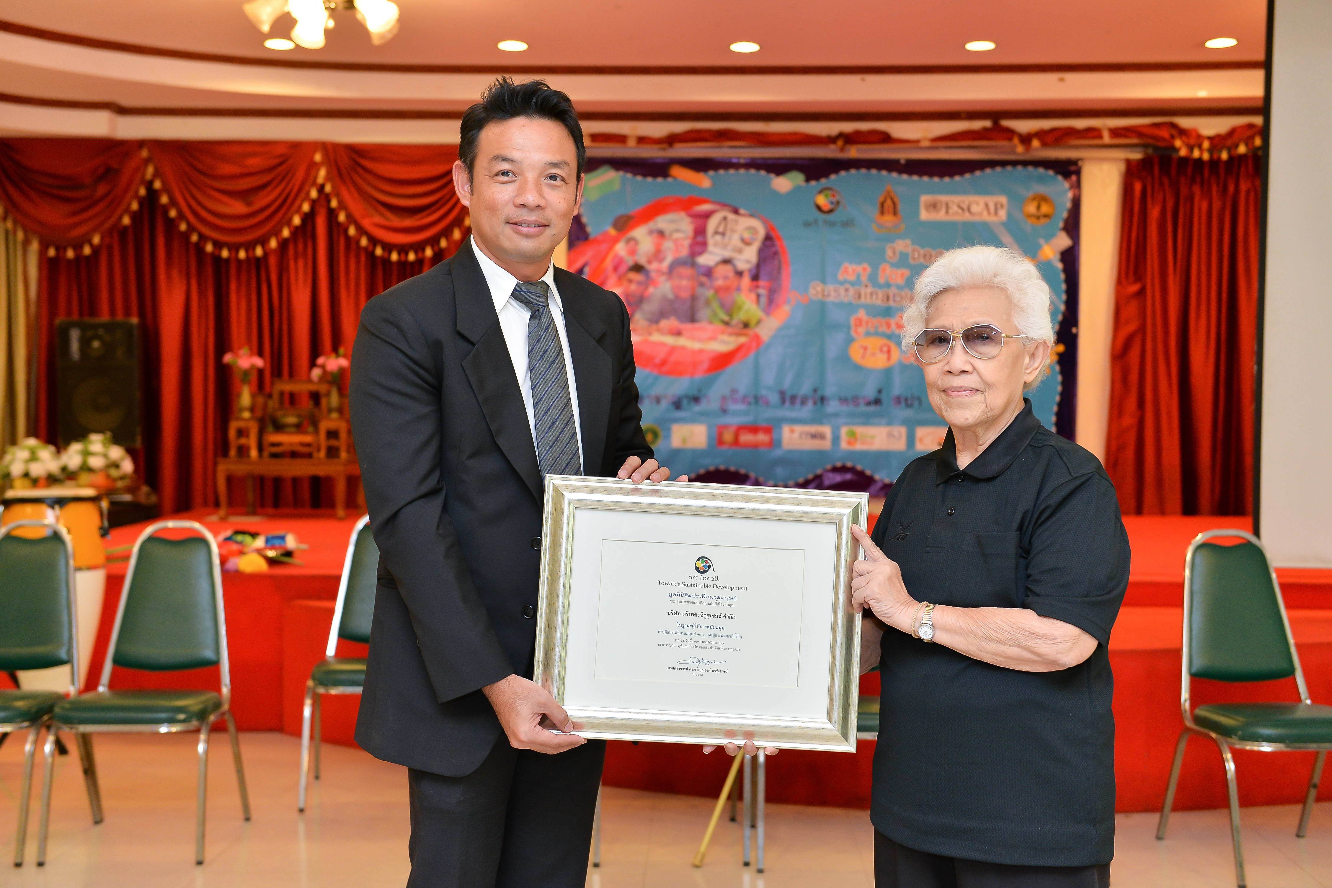 มูลนิธิกลุ่มอีซูซุ โดยนายพูนทรัพย์ มิ่งวัฒนบุญ ผู้ช่วยผู้จัดการทั่วไป บริษัท ตรีเพชรอีซูซุเซลส์ จำกัด เป็นตัวแทนรับมอบประกาศเกียรติคุณ จากศาสตราจารย์กิตติคุณอำไพ สุจริตกุล ที่ปรึกษากิตติมศักดิ์มูลนิธิศิลปะเพื่อมวลมนุษย์ ในฐานะผู้ทำประโยชน์แก่สังคม ในพิธีเปิดค่ายศิลปะเพื่อมวลมนุษย์ “Art for All 2560”