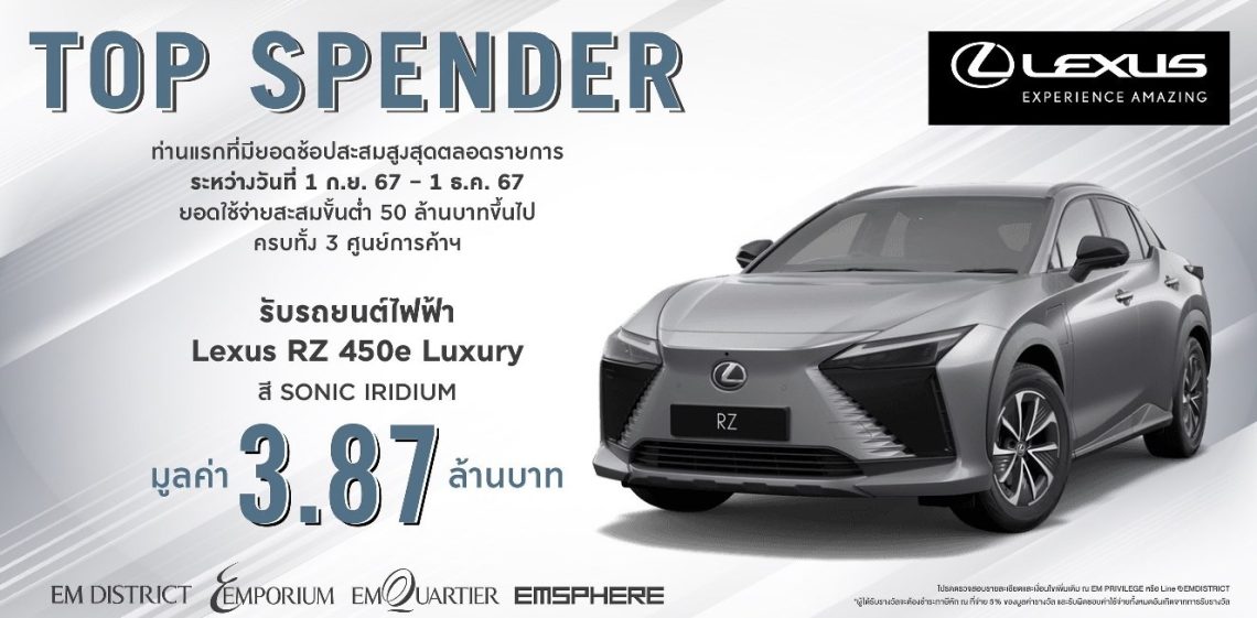 เลกซัส ประเทศไทย จับมือ EM DISTRICT กระตุ้นตลาดต่อเนื่องในไตรมาสที่ 4 ด้วยการจัดแคมเปญใหญ่ แจกรถยนต์ไฟฟ้า LEXUS RZ 450e Luxury สี SONIC IRIDIUM มูลค่า 3.87 ล้านบาท ให้กับสุดยอดนักช้อปที่มียอดใช้จ่ายสะสมรวมสูงสุดตลอดแคมเปญ เริ่มต้นที่ 50 ล้านบาทขึ้นไป ระหว่างวันที่ 1 กันยายน จนถึง วันที่ 1 ธันวาคม 2567 ที่ศูนย์การค้าเอ็มโพเรียม เอ็มควอเทียร์ และเอ็มสเฟียร์