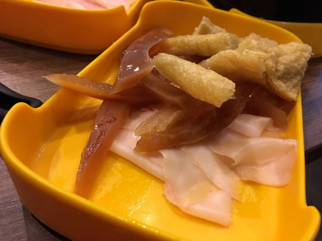 ส่วนที่เป็นบุฟเฟต์มีให้เลือกหลากหลาย เนื้อสันคอหมูสไลด์ , เนื้อสันนอกหมูสไลด์, เนื้อสามชั้นหมูสไลด์,ตับหมู, เต้าหู้ปลา, ลูกชิ้นและผักต่างๆ ส่วนที่ราคาสูงๆ อย่างเนื้อวัวก็มีนะ แต่ต้องสั่งเพิ่มในแบบ A la carte  ซึ่งราคาก็มีหลายแบบ ส่วนซูชิก็สามารถสั่งตามใบสั่งอาหารได้เลยครับ มีหลายเมนูราคาไม่แพง ในส่วนตัวชูโรงอย่าง “น้ำจิ้มชาบู” จะมีสามแบบ คือน้ำจิ้มสูตรพิเศษของ ทางร้าน หน้าตาจะออกแนว น้ำจิ้มสุกี้หน่อยๆ น้ำจิ้ม พอนสึ ที่มีโชยุกับเหล้ามิรินเป็นตัวทีเด็ด และ น้ำจิ้มงา
