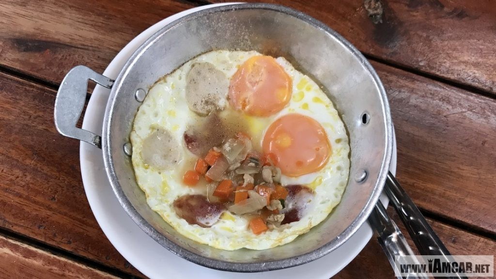 และเมนู “ไข่กระทะ” ไข่ไก่ 2 ฟอง จัดเสริฟมาในกระทะร้อนๆ หอมกลิ่นเนยโชยมาแต่ไกล โรยหน้าด้วยหมู กุนเชียง และหมูสับผัด ชอบไข่แบบสุกมากสุกน้อยก็สามารถสั่งได้ค่ะ