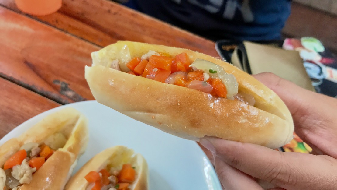 ส่วนเมนู “ขนมปังใส่ไส้” ที่ร้านใช้ขนมปังบาแกตที่อบจนนุ่มแล้วผ่ากลาง ทาเนย ใส่กุนเชียง หมูหยอง โปะหน้าด้วยหมูสับผัดกับแครอต หอมใหญ่ และต้นหอมซอย รับรองว่าอร่อยถูกใจสำหรับคนชอบทานผักแน่นอน