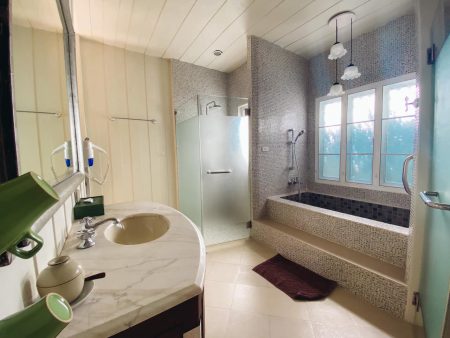 และอีกห้องชื่อ เย็นกมล ค่ะ ตกแต่งโทนหวานๆ มีอ่างอาบน้ำเช่นกันแต่เป็นแบบ Indoor ค่ะ
