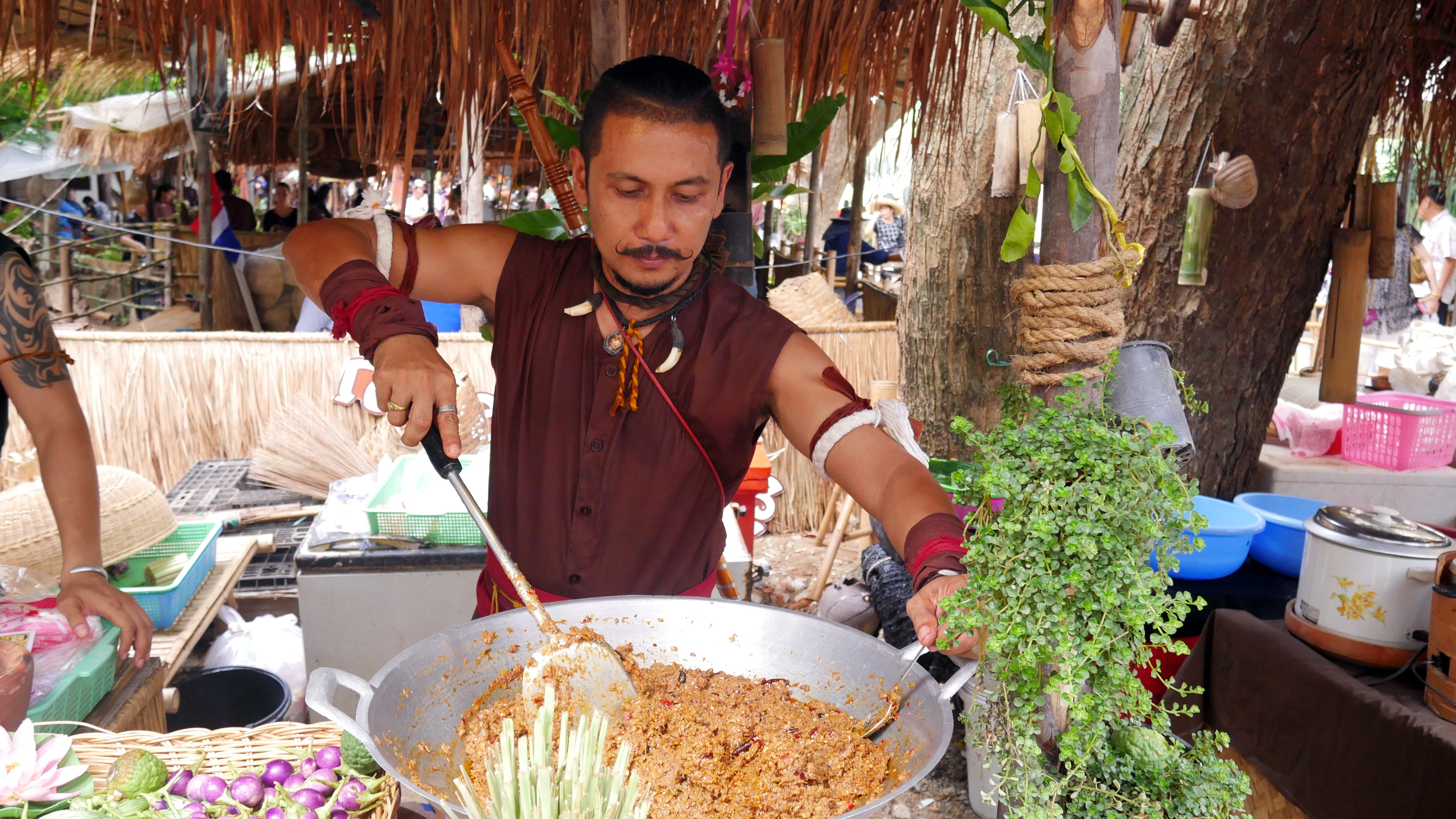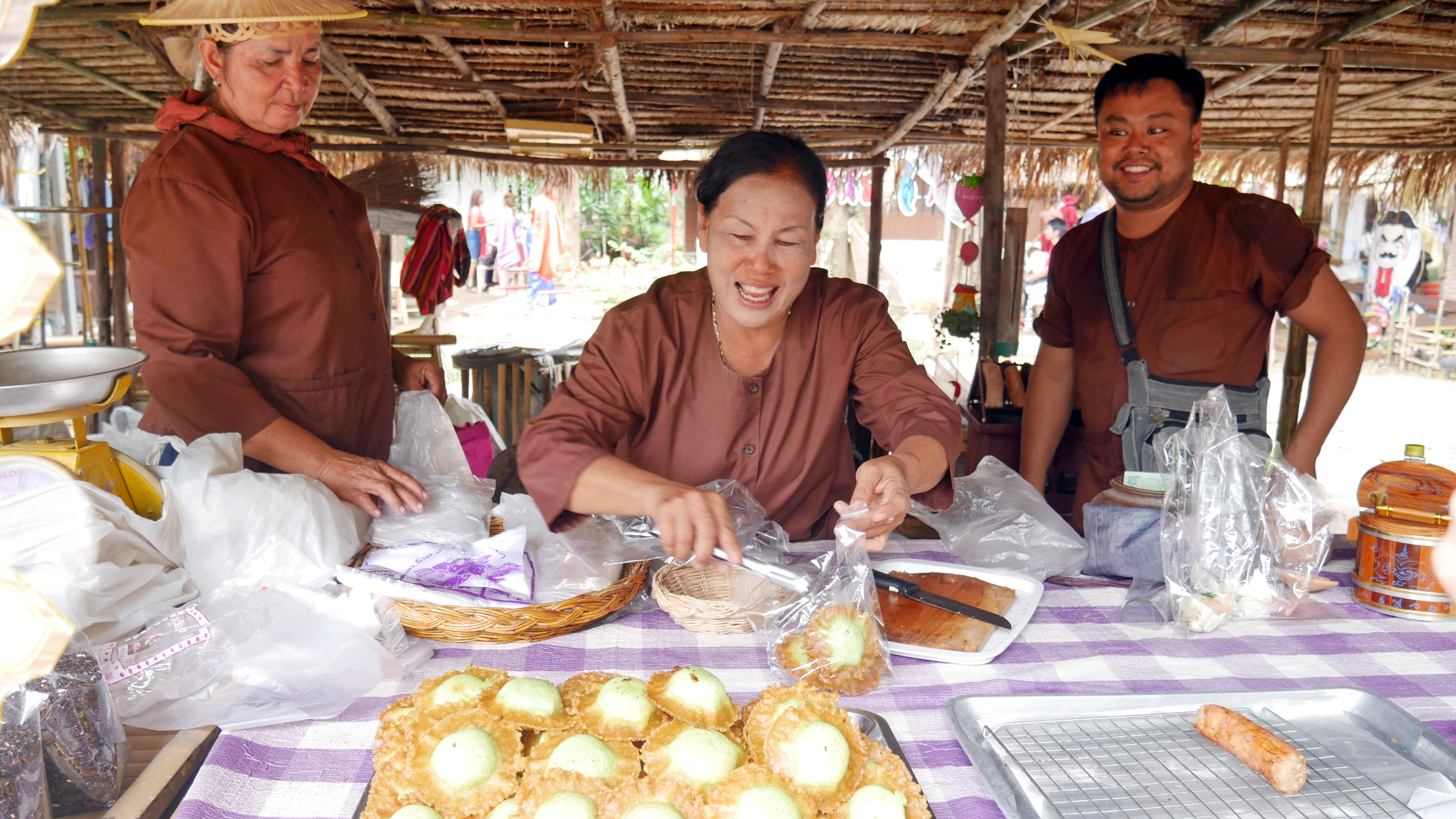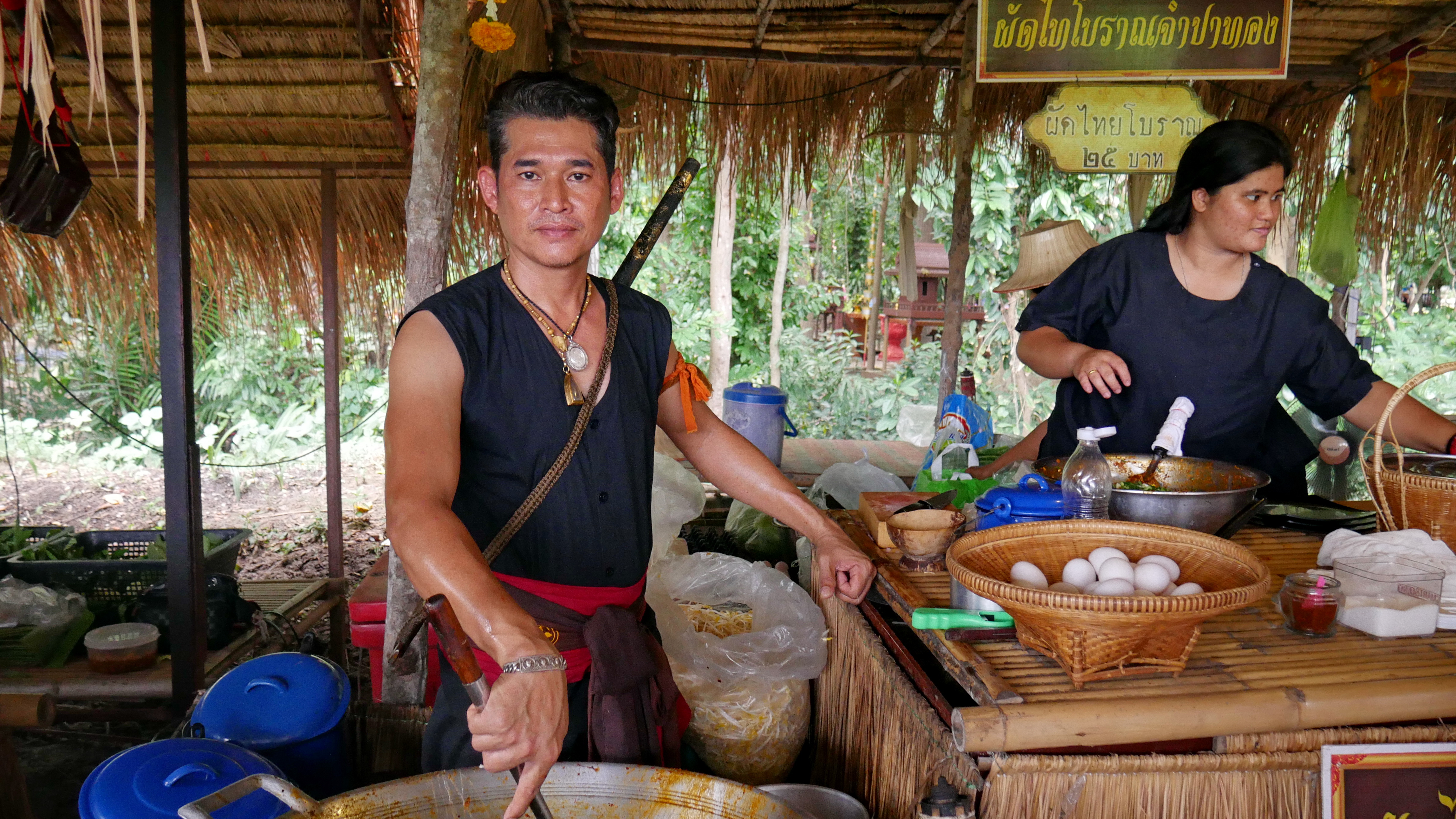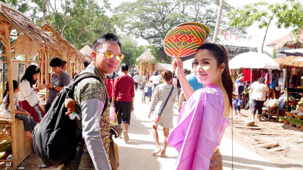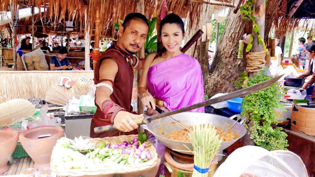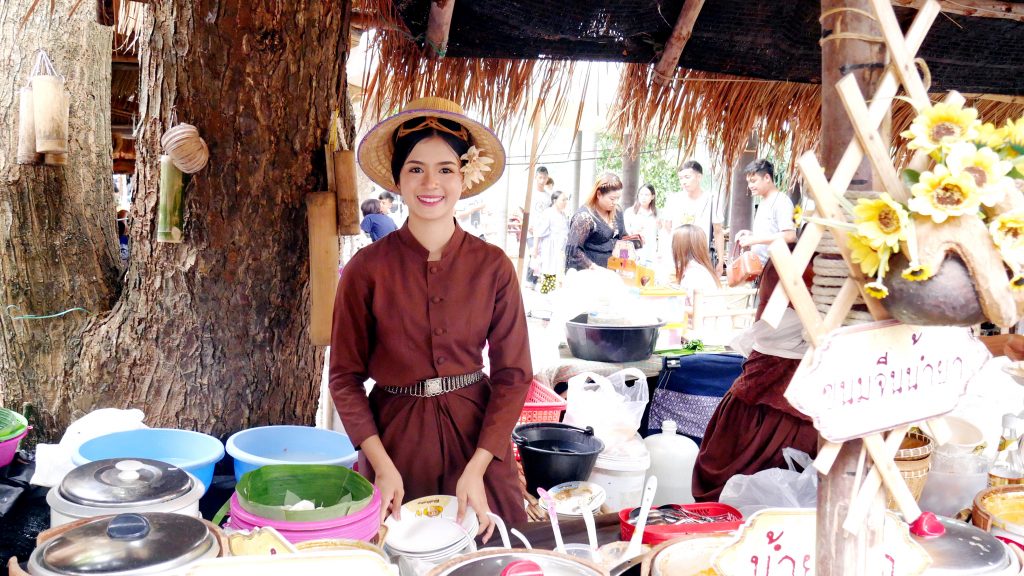 นอกจากนักท่องเที่ยวจะแต่งชุดไทยเดินช็อปชิมกันแบบย้อนยุคแล้ว ::: พ่อค้าแม่ค้าที่นี่ เค้าก็ใส่ชุดไทยแบบชาวบ้านบางระจันกันทุกร้าน และพร้อมใจกันพูดจาภาษาบ้านระจันโบราณ เป็นที่ไพเราะเสนาะโสตดีแท้