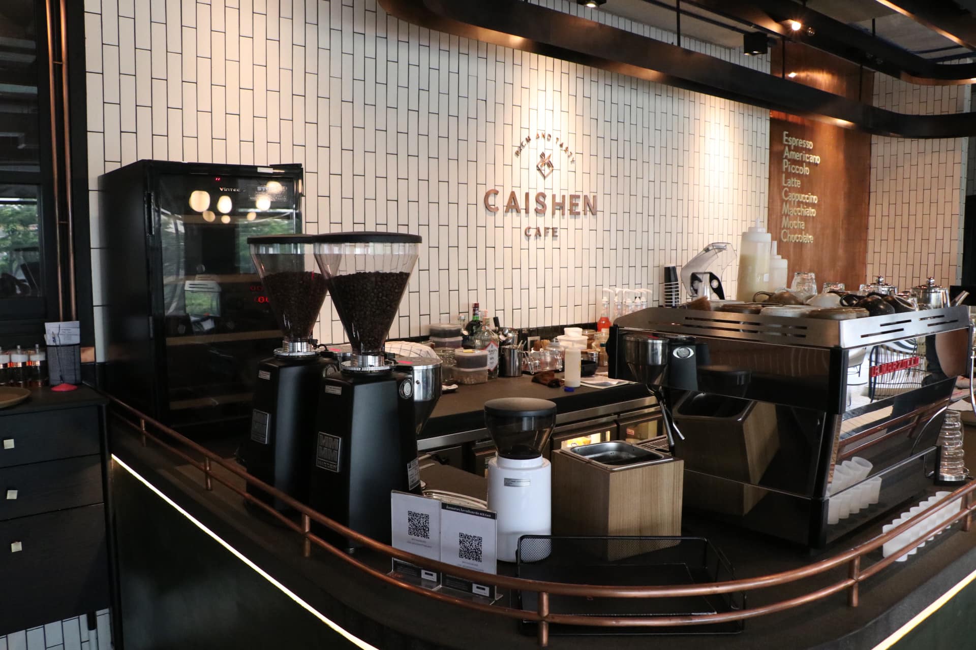 ร้าน CAISHEN CAFE ตกแต่งโทนสีดำ-น้ำตาล โดดเด่นด้วยการตกแต่งสไตล์ Industrial Loft ที่มีความทันสมัย ผสมผสานความดิบเท่ มีความคลาสสิคลงตัวอย่างบอกไม่ถูก