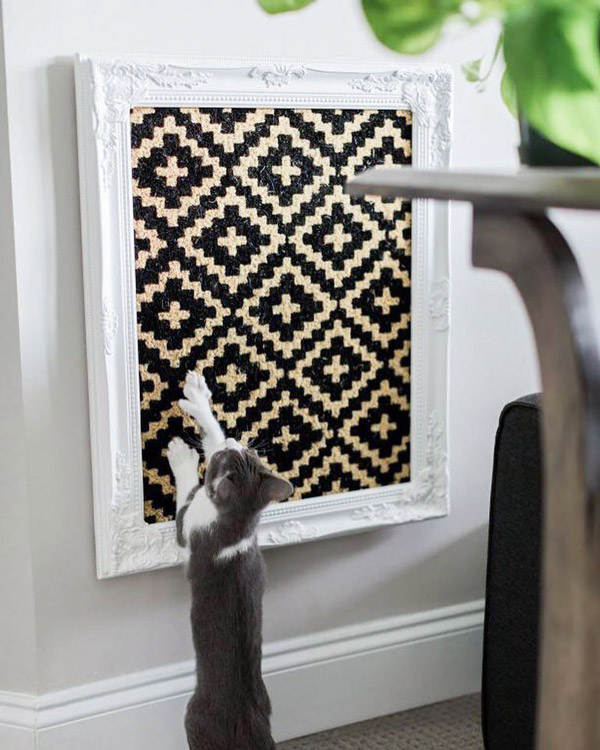 ของแต่งบ้านแบบ 2 in 1 ที่เป็นทั้งงานศิลปะติดผนังและพื้นที่ฝนเล็บของน้องแมว ซึ่งวัสดุหลักที่ใช้คือกรอบภาพอันเก่าที่นำมาประกอบร่างรวมกับพรมดักฝุ่น เมื่อผ่านการทำความสะอาดและลงสีใหม่พร้อมทั้งนำมาประกอบเข้ากับพรมที่มีลวดลายสวย ๆ ก็ดูไม่ออกเลยล่ะค่ะ ว่างานศิลปะเก๋ ๆ ชิ้นนี้จะเป็นของเล่นสำหรับน้องแมวได้ด้วยเหมือนกัน