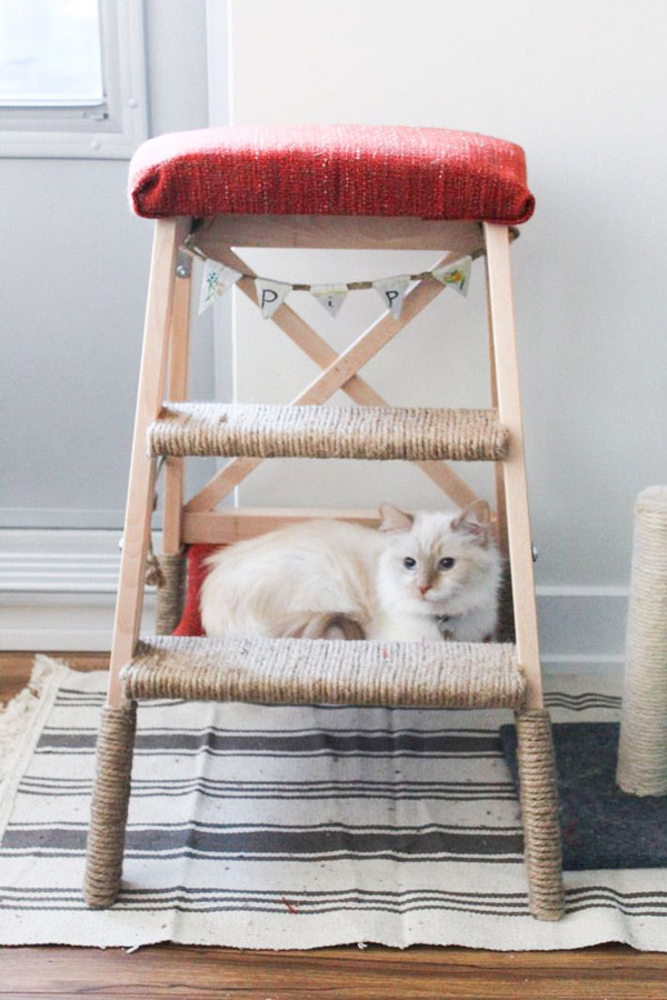มาลงมือสร้างคอนโดแมวขนาดย่อมจากจากบันไดพับอเนกประสงค์กันค่ะ เพราะด้วยโครงสร้างของบันไดลักษณะนี้ที่มีช่อง มีชั้นและพับตั้งได้อยู่แล้ว ทำให้เจ้าของไม่ต้องลงมือออกแรงประกอบเองทั้งหมด แค่นำมาตกแต่ง ต่อเติมเปลผ้าหรือเบาะนิ่ม ๆ เพิ่มเข้าไป เสริมด้วยไอเท็มที่น้องแมวแต่ละตัวชอบ พอถึงเวลาก็สามารถนำออกมาตั้งวางให้น้องแมวได้สนุกอย่างเต็มที่ และหากต้องการใช้พื้นที่ในบ้านสำหรับกิจกรรมอื่น ๆ ก็พับเก็บได้สบาย ๆ ค่ะ