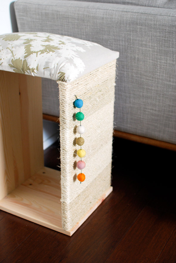 อีกไอเดียสำหรับการเปลี่ยนพื้นที่ใช้สอยในชีวิตประจำวันให้เป็นมุมสำหรับน้องแมวได้ด้วย ก็คือการเปลี่ยนพื้นผิวบริเวณนั้นให้เป็นที่สำหรับฝนเล็บของน้องแมว วิธีง่าย ๆ คือการนำเชือกป่านมาติดหรือพันรอบ ๆ พร้อมกับนำของเล่นอันจิ๋ว ๆ อย่างลูกบอล ตุ๊กตาผ้าหรือขนนกมาผูกติดเอาไว้ ซึ่งการใช้ไอเดียนี้นอกจากจะช่วยให้น้องแมวได้มีมุมของตัวเองมากขึ้นก็ยังช่วยป้องกันความเสียหายที่อาจเกิดขึ้นกับพื้นผิวเฟอร์นิเจอร์ในบ้านได้ด้วย