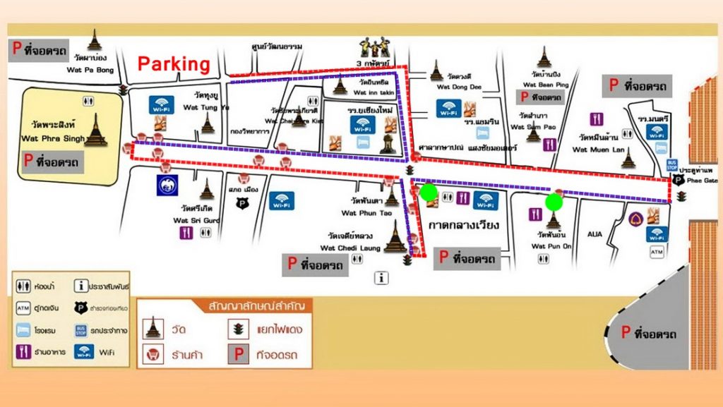 เส้นสีแดง คือ การเดินขาไป ส่วน สีน้ำเงิน คือการเดินขากลับ (เพราะการตั้งร้านค้าของถนนคนเดิน จะเป็นฝั่งซ้าย กลาง ขวา) ถ้าเราเดินแบบนี้จะทำให้เดินเก็บได้ครบ .. ส่วน จุดสีเขียว สองจุด ในช่วงขากลับ เป็นจุดแวะพัก จุดที่ 1 บริเวณวัดพันอ้น และ จุดที่ 2 ศูนย์สถาปัตยกรรมล้านา คุ้มเจ้าบุรีรัตน์