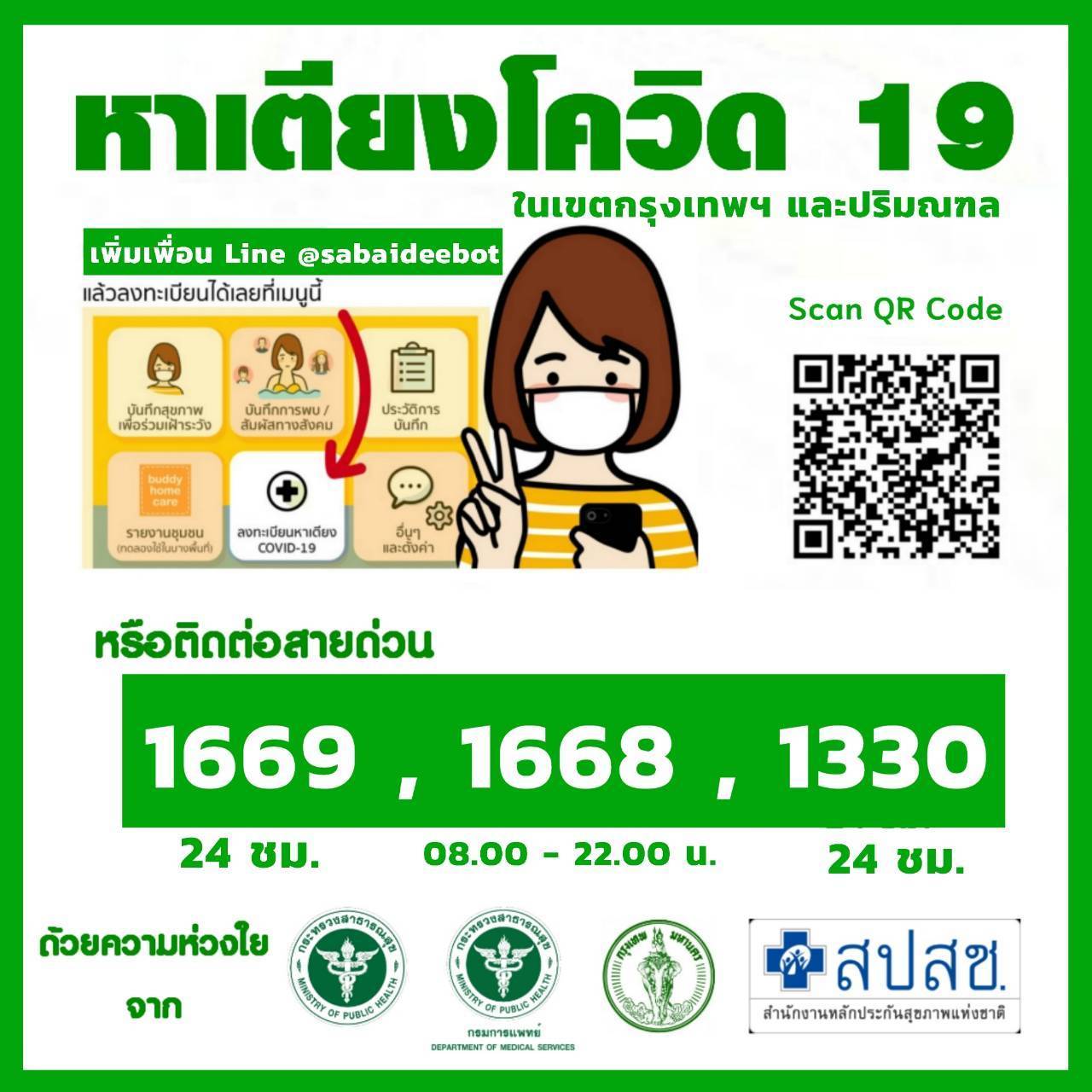ติดต่อได้ที่ Line @sabaideebot หรือที่สายด่วน 1669 , 1668 ,1330