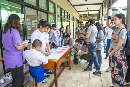 เมื่อคณะสื่อมวลชนมาถึงน้องๆ นักเรียนได้นั่งรอรับประทานอาหารกลางวันกันอย่างพร้อมเพรียง ณ โรงอาหาร โดยพี่ๆ สื่อมวลชนได้ดูแลเสิร์ฟอาหาร และป้อนอาหารให้แก่น้องๆ ที่ไม่สามารถช่วยเหลือตัวเองได้ เพราะนักเรียนที่นี่มีทั้งพิการทางสายตา และพิการซ้ำซ้อน ณ ปัจจบันทางโรงเรียนได้ดูแลน้องๆ 19 คน จัดการเรียนการสอน 3 ภาษา คือ ภาษาไทย ภาษาอังกฤษ และภาษาจีน ควบคู่ไปกับการพัฒนาทักษะด้านการดนตรีและกีฬา โดยน้องๆ ทุกคนดูแจ่มใส ช่างพูดช่างคุย น่ารักเข้ากับคนได้ง่าย เรารับรู้ได้ถึงความสุขและพลังบวกที่น้องๆ ส่งผ่านมาถึงพวกเราทุกคน แม้ร่างกายของน้องๆ จะไม่สมบูรณ์เต็มร้อย แต่พวกเขามีหัวใจที่แข็งแกร่ง การมาพบกับน้องๆ ครั้งนี้ ทำให้เราได้ย้อนกลับมาพิจารณาตัวเอง ในขณะที่เรามีร่างกายที่สมบูรณ์ครบถ้วน มีความเป็นอยู่ที่ไม่ลำบาก แต่หลายๆ ครั้งเราบ่นท้อ บ่นโทษโชคชะตาในเวลาที่เราไม่สมหวัง ทั้งๆ ที่เรายังพยายามไม่มากพอ ต้นทุนชีวิตของเรานั้นดีกว่าพวกน้องๆ มาก ดังนั้นเราต้องใช้ชีวิตอย่างเกิดประโยชน์ รู้จักการเป็นผู้ให้ ส่งมอบความปรารถนาดีให้แก่กันและกัน เป็นฟันเฟืองเล็กๆ ที่ช่วยขับเคลื่อนให้สังคมน่าอยู่ต่อไป