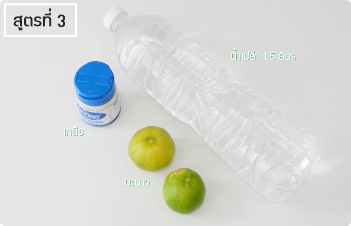 สูตรที่ 3 น้ำเปล่า 1 ลิตร + มะนาว 2 ลูก + เกลือ 2 ช้อนชา