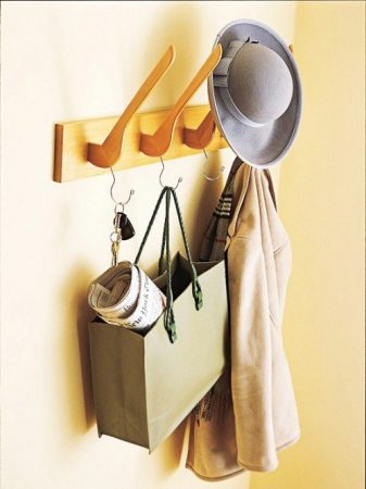 เพียงนำแผ่นไม้สวยๆ ที่มีสีใกล้เคียงกับไม้แขวนเสื้อที่มีอยู่แล้ว นำมาตัดเป็นแผ่นให้มีขนาดพอเหมาะกับพื้นที่ที่จะใช้แขวน และตัดไม้แขวนเสื้อที่เตรียมไว้ก่อนหน้าให้เหลือประมาณ 60 เปอร์เซ็นต์เหมือนในภาพ นำแผ่นไม้มาต่อกันกับไม้แขวนเสื้อ แค่นี้ก็จะได้ที่แขวนสวยๆ มาไว้ในห้องนั่งเล่น เพื่อใช้แขวนถุงผ้า กระเป๋า ผ้าพันคอ ฯลฯ ที่แขวนเมื่อไหร่ก็ดูดีมีระเบียบขึ้นมาทันที