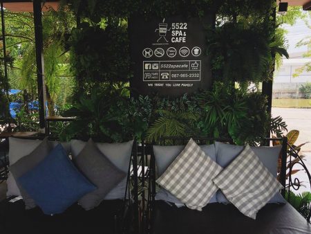 ภายในร้าน “5522 Spa & Cafe” ตกแต่งได้ฟิวธรรมชาติสุดๆ ที่นั่งถูกจัดสรรขึ้นมาได้ลงตัวและใช้พื้นที่ทุกตารางนิ้วได้ดี ดูกลมกลืน มีที่นั่งทั้งแบบ In door และ Out door มีทั้งโซนที่เป็นชิงช้า และโต๊ะตั้งเม้าท์มอย หลังร้านยังเป็นวิวสวนผัก ผลไม้ของชาวบ้าน มีสะพานไม้ให้เดินข้ามน้ำ และเรือลอยรำอยู่ให้ได้ลงไปพายได้ นอกจากนี้ที่ร้านยังมีสปาไว้บริการด้วยนะคะ