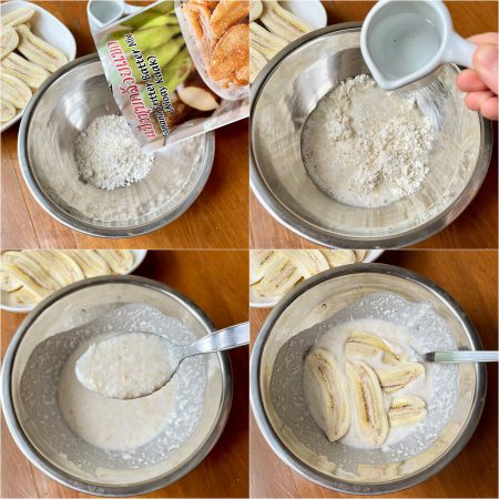 2. ฉีกแป้งโลโบ 1 ซอง เอามาผสมน้ำเย็น 7 ช้อนโต๊ะ แล้วคนให้เข้ากัน ไม่ต้องใส่อะไรเพิ่มเลยนะ คือในแป้งกล้วยแขกเนี่ย แม่งมีมะพร้าว กับ งาผสมอยู่แล้วด้วย