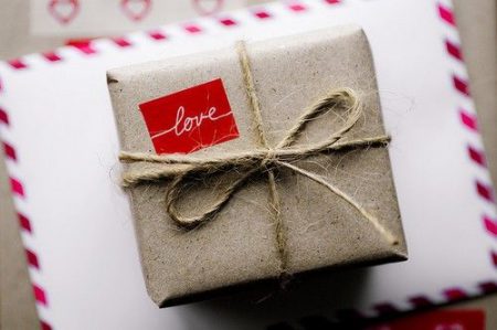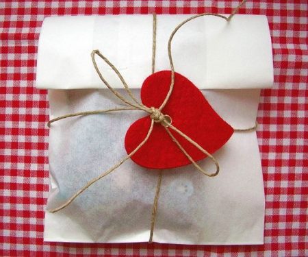 กระดาษสีน้ำตาล เชือกมัด มีการ์ดเล็กๆ สีแดงเขียนคำว่า Love เข้าไป แป่ะไว้แบบนี้ แค่นี้ก็น่ารักแล้ว