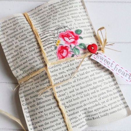 กระดาษหนังสือ หรือหนังสือพิมพ์ ภาษาอังกฤษ ไม่มีภาพอื่นแทรกแบบนี้ มีแต่ตัวหนังสือล้วนๆ เอามาห่อของขวัญก็น่ารักดีค่ะ เพิ่มความน่ารักเข้าไปด้วยภาพดอกกุหลาบสักหน่อย (แต่ถ้าเป็นหนังงสือพิมพ์ของไทยเรา อาจจะต้องเลือกกันนานนิดนึง เพราะภาพข่าวอาจจะปะปนไปทั่ว)