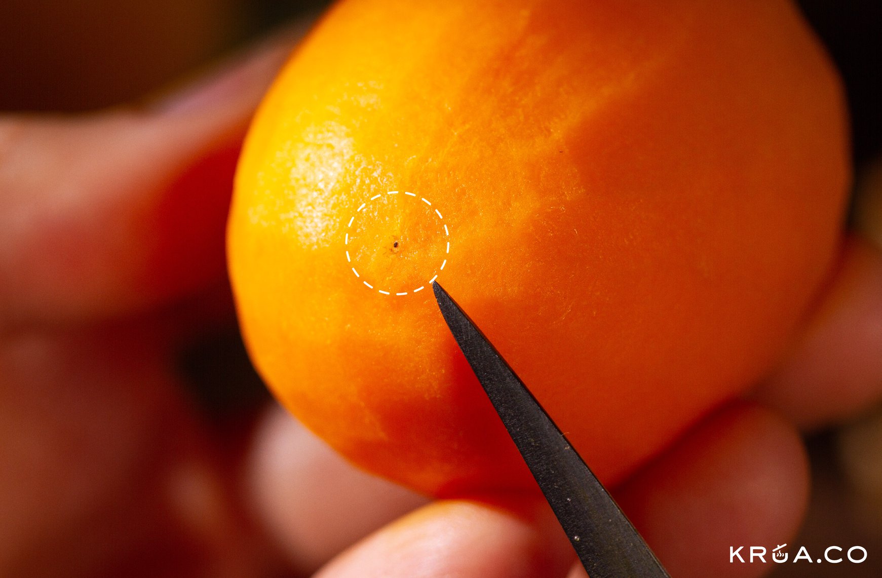 4) หลังจากนั้นค่อยๆ ดันมีดเข้าไปตามรอยที่ลากเส้นวงกลมไว้ โดยพยายามให้มีดแนบกับเม็ดมะยงชิดมากที่สุด ให้รู้สึกว่าปลายมีดอยู่ที่ประมาณครึ่งหนึ่งของผลมะยงชิดแล้วดึงมีดออก