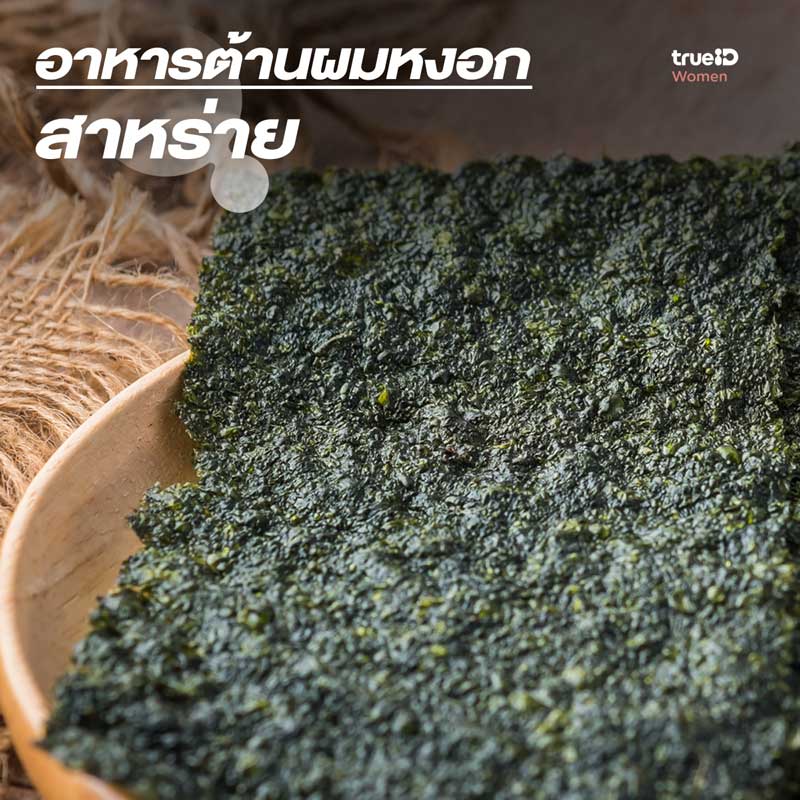 สาหร่ายโนริที่ใช้สำหรับห่อข้าวปั้น รวมถึงสาหร่ายวากาเมะและคอมบุต่างก็สามารถช่วยบำรุงเส้นผมให้แก่เราได้ เนื่องจากสาหร่ายเหล่านี้จะเข้าไปช่วยกระตุ้นการทำงานของเมลาโนไซต์ (melanocyte) ซึ่งเป็นตัวตั้งต้นในการสร้างเซลล์เมลานินและทำให้เกิดสีดำในเส้นผมค่ะ