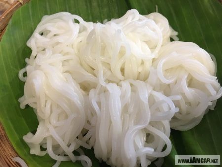 ขนมจีนเส้นสดของครัวมุกดา เส้นเล็กนุ่มเหนียว ขยุ้มมาเป็นคำๆ ขายเป็นกระจาด กระจาดละ 15 บาท