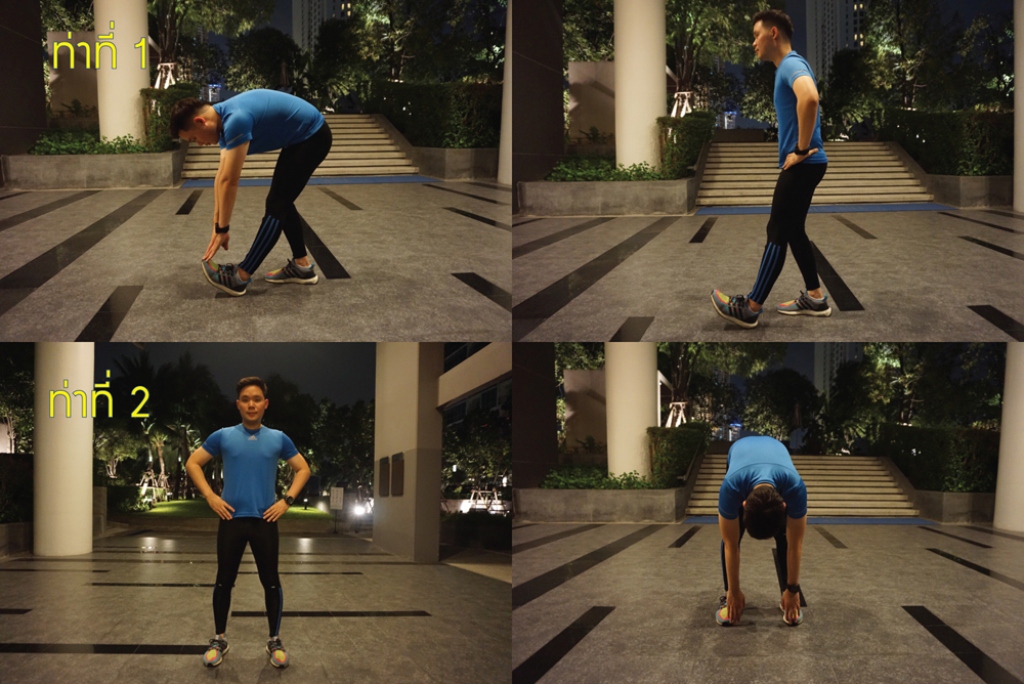 2.กล้ามเนื้อหลังส่วนล่าง (Lower Back) ส่วนนี้จะเป็นกล้ามเนื้อมัดที่ 2 กล้ามเนื้อด้านหลัง โดยกล้ามเนื้อหลังจะเป็นกล้ามเนื้อมัดที่ช่วยพยุงลำตัวทำให้ตรง ใช้ในการนั่ง เดิน ยืน กล้ามเนื้อมัดนี้ไม่แข็งแรงเวลาเราทำกิจกรรมต่างๆ เราจะห่อตัวและปวดหลังได้ง่าย ดังนั้นถ้าเราต้องการที่จะยืดกล้ามเนื้อมัดนี้เราต้องผ่อนคลาย ยืนตัวตรงแล้วค่อยๆ ก้มลงไปเอามือแตะพื้นโดยที่เข่าต้องตึงอยู่ ถ้าทำถูกต้องจะรู้สึกว่ากล้ามเนื้อหลังและต้นขาส่วนหลังตึง นับ 1 ถึง 10 คือ 1 เซ็ท โดยทำทั้งหมด 4 เซ็ท
