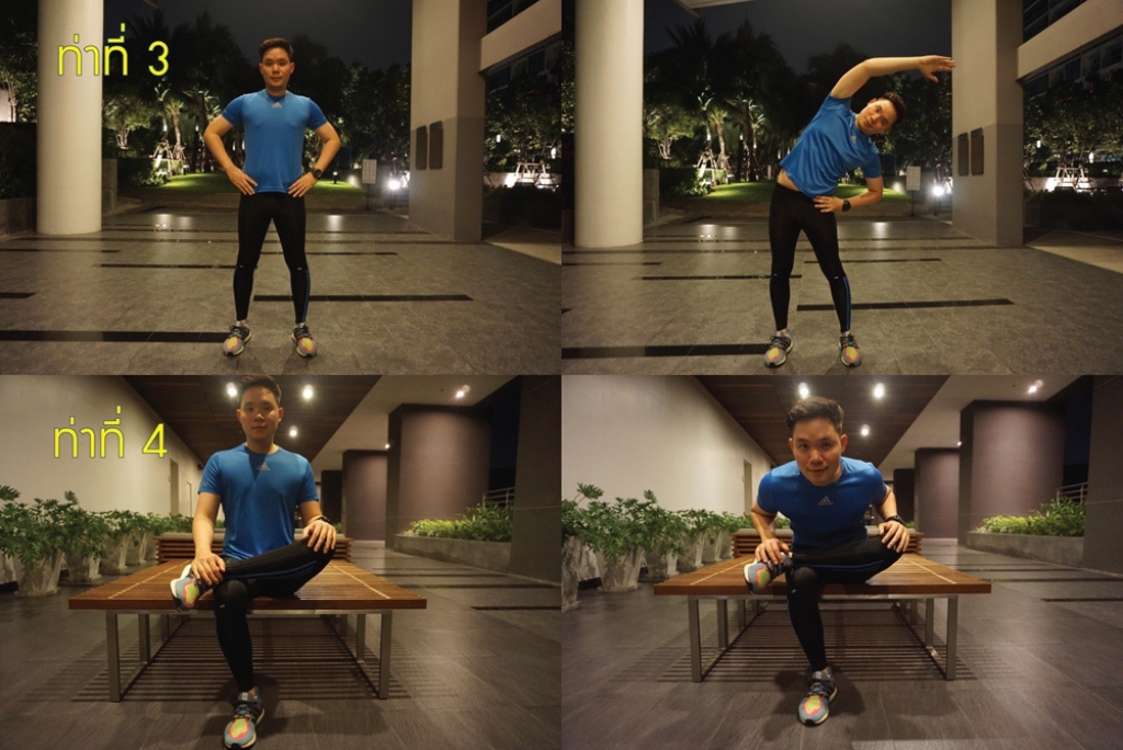 3.กล้ามเนื้อหลังด้านข้าง (Quadratus lumborum) ส่วนนี้จะเป็นกล้ามเนื้อมัดที่ 3 กล้ามเนื้อในส่วนหลังด้านข้าง โดยปกติกล้ามเนื้อหลังเรามักจะใช้ควบคู่กันทั้งหมดในขณะที่เรานั่งหลังตรง ยืน เดิน ก็จะมีการปวดหลัง ท่านี้จะเป็นการยืดกล้ามเนื้อในส่วนหลังด้านข้าง หรือเรียกว่าการยืดเอวด้านข้าง วิธีการทำคือเราต้องกางขาให้กว้างระดับไหล่แล้วบิดเอวไปด้านข้างซึ่งง่ายมากใครๆ ก็สามารถที่จะทำได้ เราจะรู้สึกว่ากล้ามเนื้อหลังด้านข้างฝั่งตรงข้ามตึงแล้วเราก็นับ 1 ถึง 10 อันนี้คือ 1 เซ็ท พอครบแล้วเราก็กลับมาอยู่ในท่าปกติแล้วทำในข้างเดิมต่อไป โดยเราจะทำข้างเดิมก่อนเสมอให้ครบ 4 เซ็ท ถึงจะเปลี่ยนข้าง