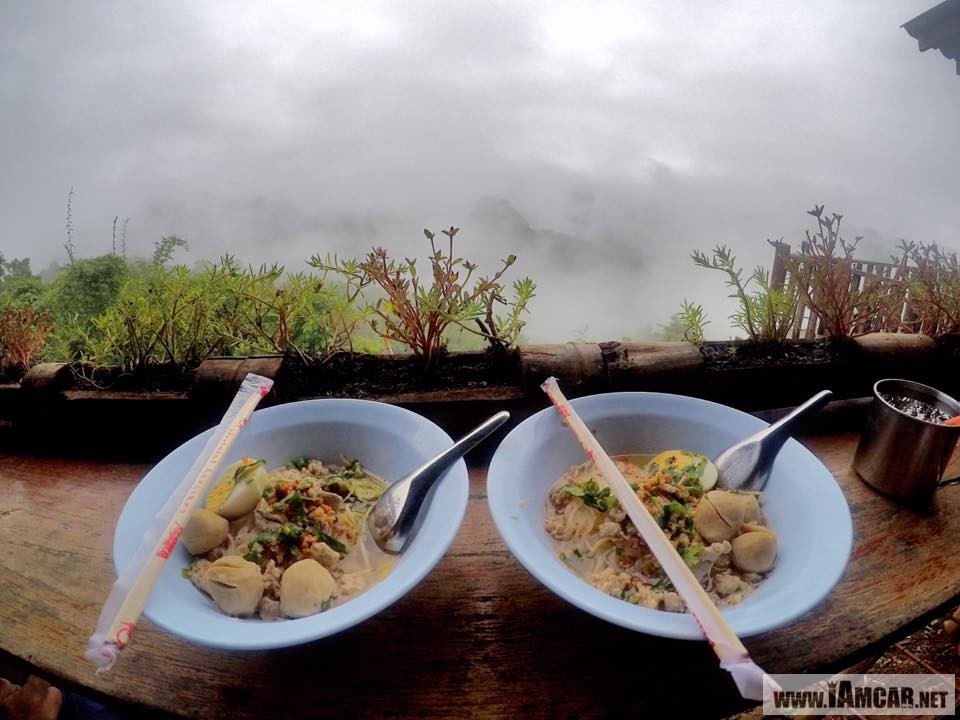 และแล้วก็เดินทางมาถึงจุดหมายของเราในคืนที่สองนี้คือ บ้านจ่าโบ ค่ะ จากกระแสโซเชียลรูปนั่งห้อยขาทานก๋วยเตี๋ยวเราเลยไม่พลาดที่จะจดลงลิสต์ไว้ในทริปนี้ด้วยค่ะ แต่ที่นี่ไม่ได้มีดีแค่ก๋วยเตี๋ยวนะคะ ไหนๆ ก็มาแล้วลองขับรถดูสัมผัสวิถีชาวบ้านหรือถ้าอยากจะตื่นมาเห็นไอหมอกในช่วงเช้าจะนอนโฮมสเตย์สักคืนก็ได้นะคะ สำหรับร้านก๋วยเตี๋ยวชื่อดังจะเปิดแต่เช้าประมาณ 06.00 น. ค่ะ เพราะจุดขายของที่นี่คือการได้นั่งทานก๋วยเตี๋ยวท่ามกลางไอหมอก เรียกได้ว่าราคาหลักสิบแต่วิวหลักล้านเลยค่ะ