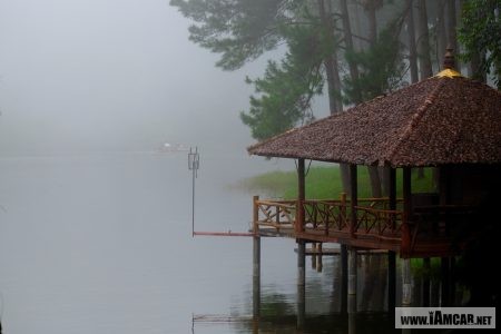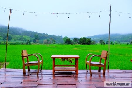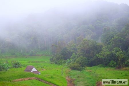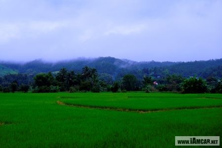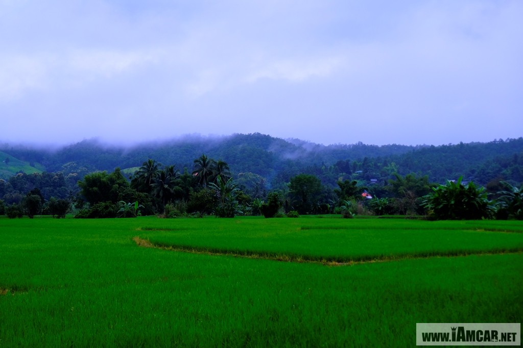 - สีเขียวของทุ่งนา กับสีของท้องฟ้า แทรกด้วยสีขาวของไอหมอก