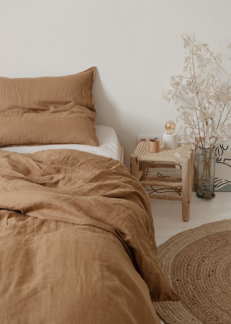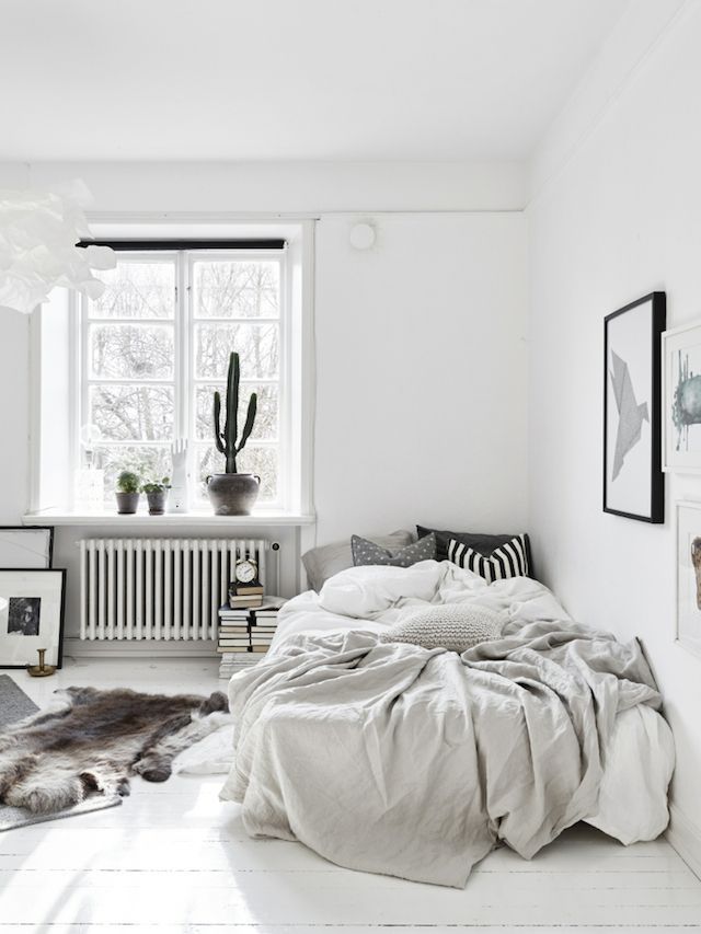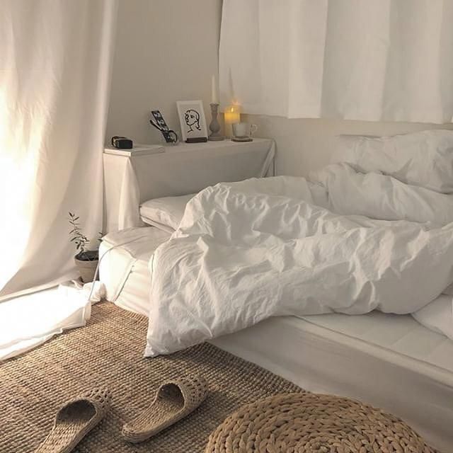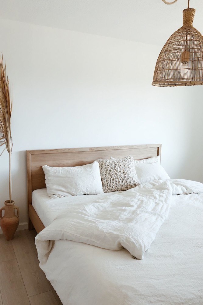 ใช้เครื่องนอนแบบเรียบง่าย เช่น ผ้าปูที่นอนและผ้านวมสีขาวเรียบๆ เพิ่ม Tuexture หมอนอิงหรือด้วยผ้าโยน (throws) ลายถักสีครีมซักผืน ก็จะได้ความมินิมอล และเพิ่มลูกเล่นให้กับเตียงได้