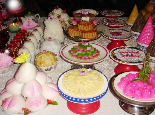 - ขนมหวาน 4 อย่าง เช่น ขนมไหว้พระจันทร์ ขนมเปี้ยะ สาคูแดง 4 ถ้วย ขนมโก๋สีขาว