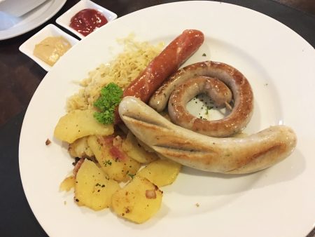 อีกหนึ่งจานที่ไม่ควรพลาดคือ ไส้กรอกบาวาเรียนรวม มีไส้กรอก 3 แบบมาในจาน อย่างแรกเป็นไส้กรอกทูริงเจอร์ ไส้กรอกหมูผสมเครื่องเทศ เนื้อหมูล้วนนุ่มปากออกรสชาติเครื่องเทศกำลังดี อีกตัวเป็นไส้กรอกหมูผสมชีส หอมชีส รสกลมกล่อม สุดท้ายเป็นไส้กรอกบราทเวิร์ส เป็นไส้กกรอกหมูรสเข้มข้น หอมหวน เสิร์ฟพร้อมมันฝรั่งอบ ผักดอง และมัสตาร์ด