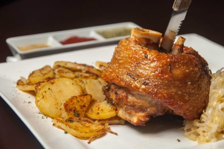 ส่วนเมนูเด็ดของทางร้านที่บอกเลยว่ามาถึงที่แล้วต้องสั่ง เริ่มต้นด้วย ขาหมูเยอรมัน สูตรเฉพาะของร้านที่ต้มให้เนื้อนุ่มก่อนนำมาอบด้วยไฟอ่อนในเตาหมุน จนทำให้หนังด้านนอกกรอบและนุ่มใน เสิร์ฟพร้อมผักดอง และน้ำจิ้มซีฟู้ด เป็นการผสมผสานความเป็นเยอรมันแท้แต่ยังแถมความแซ่บในแบบไทยๆ มาให้แบบลงตัว